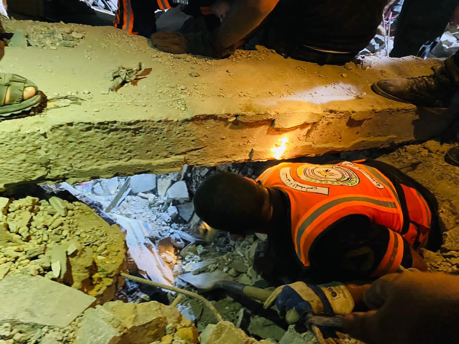 قوات كبيرة من الدفاع المدني والشرطة والخدمات الطبية العسكرية، تساندها طواقم بلدية رفح ووزارة الأشغال، تعمل في هذه الأثناء من أجل إخلاء العديد من المفقودين من تحت الأنقاض، جراء القصف الإسرائيلي لأحد المنازل في رفح جنوب قطاع غزة مساء أمس السبت.