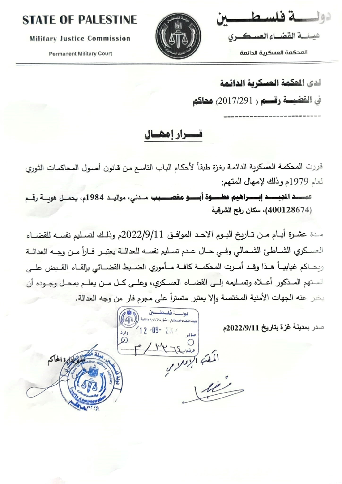 أمهلت المحكمة العسكرية الدائمة- التابعة لهيئة القضاء العسكري المتهم عبد المجيد إبراهيم عطوة أبو مغصيب، هوية رقم (400128674) سكان رفح الشرقية، عشرة أيام من تاريخ يوم الأحد الموافق 11/09/2022م، لتسليم نفسه للقضاء العسكري.
