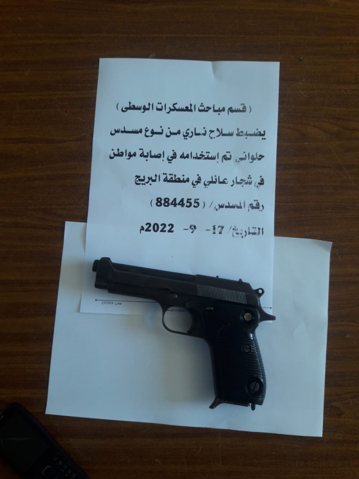 أوقفت المباحث العامة بالمحافظة الوسطى قسم المعسكرات المدعو محمد (م)، بعد قيامه بإطلاق النار خلال شجار عائلي في مخيم البريج بالمحافظة وقع بين عائلتي (ن)، (م)؛ أدى إلى إصابة المواطن عبد العزيز (ن) بطلق في القدم.