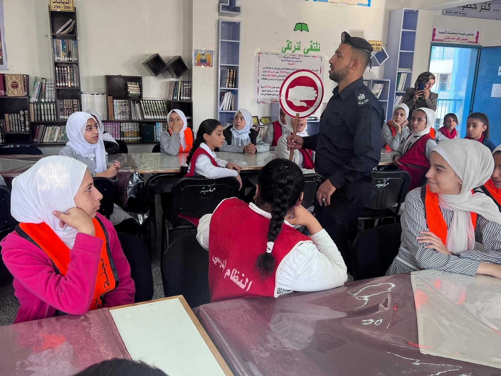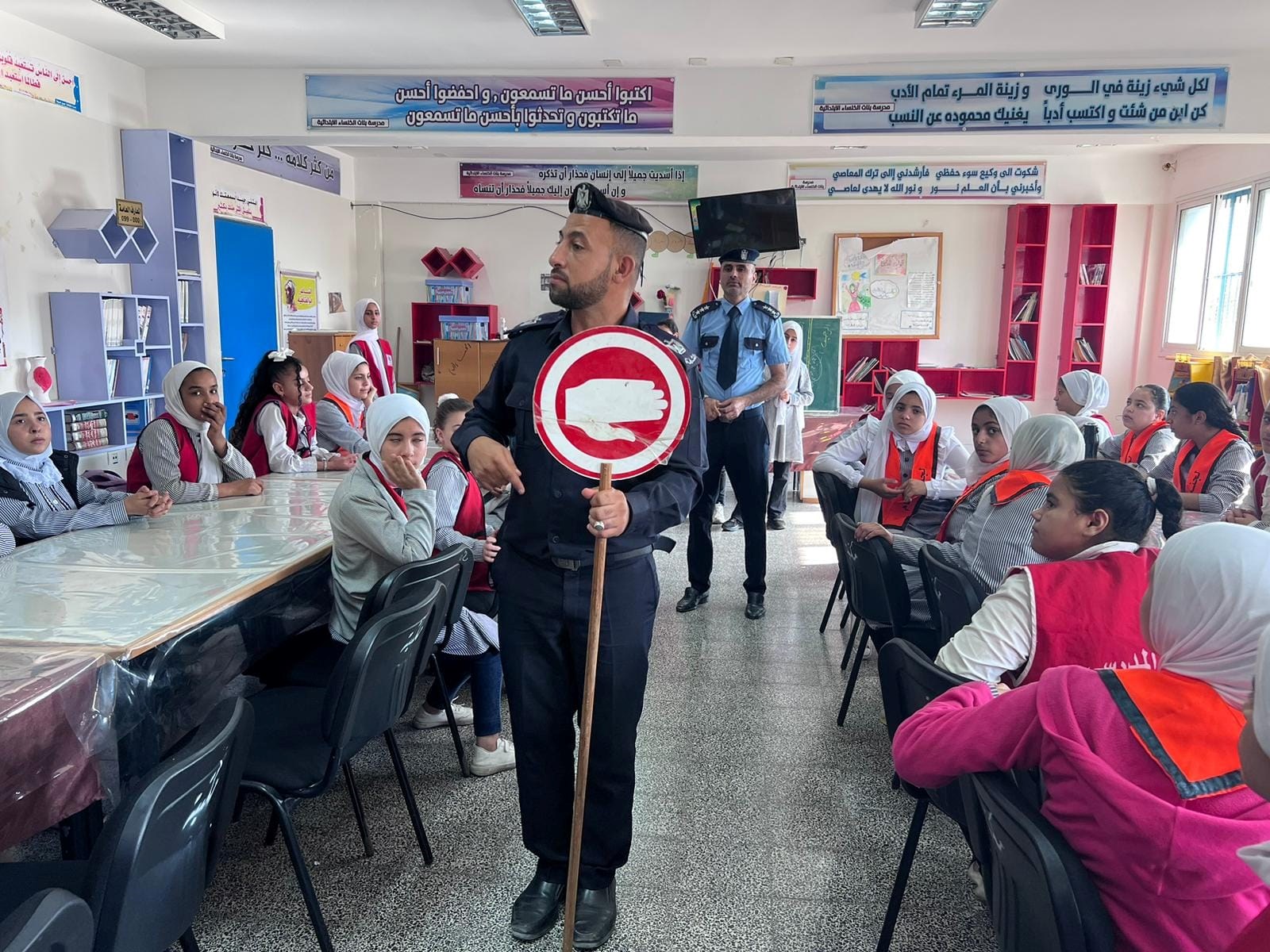 وفي نفس السياق، جرى تدريب طالبات الصحة المدرسة في مدرسة الخنساء للمشاركة في دور الشُرطي الصَغير.