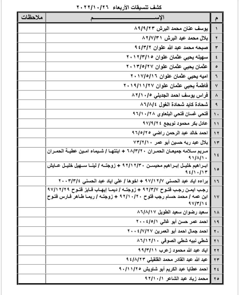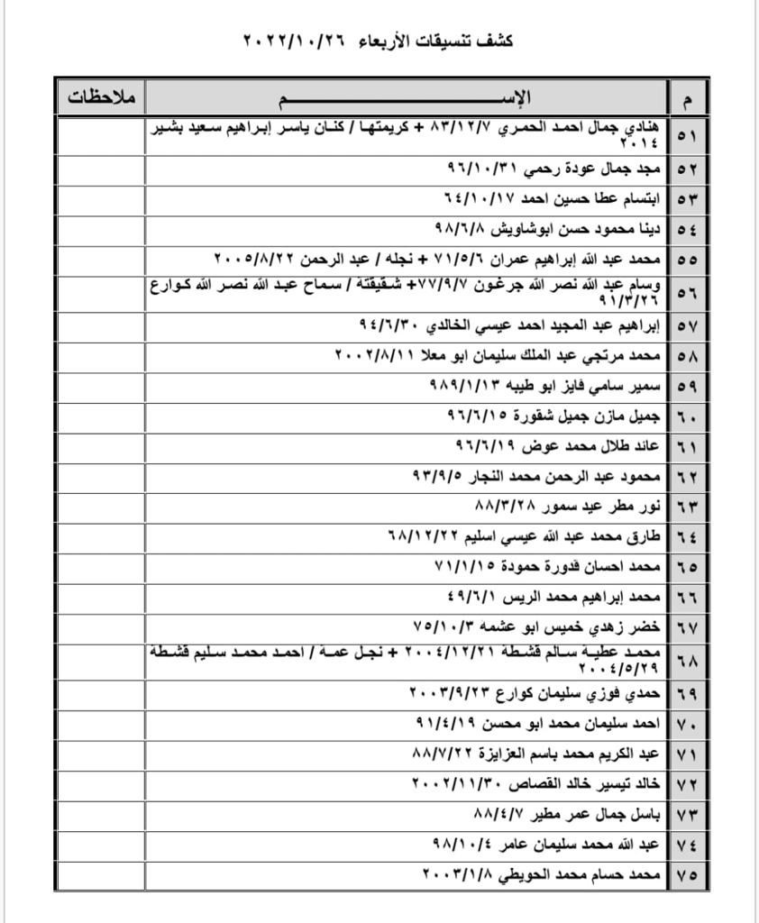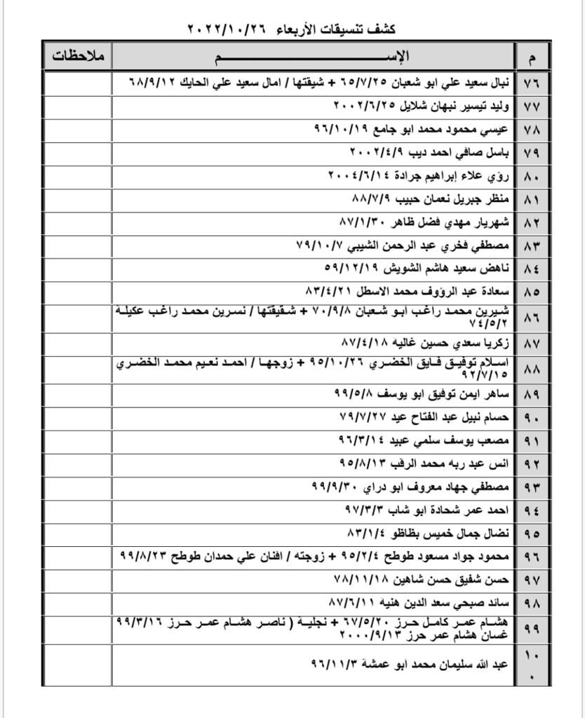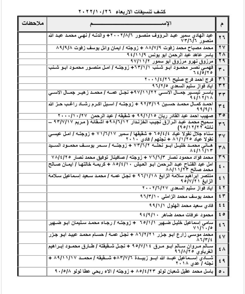 تعلن الهيئة العامة للمعابر والحدود بوزارة الداخلية والأمن الوطني عن وصول كشف "تنسيقات مصرية" للسفر عبر معبر رفح البري يوم الأربعاء (26 أكتوبر)، والذين عليهم التواجد س 8:00 صباحاً في الصالة الخارجية للمعبر لتسهيل سفرهم.