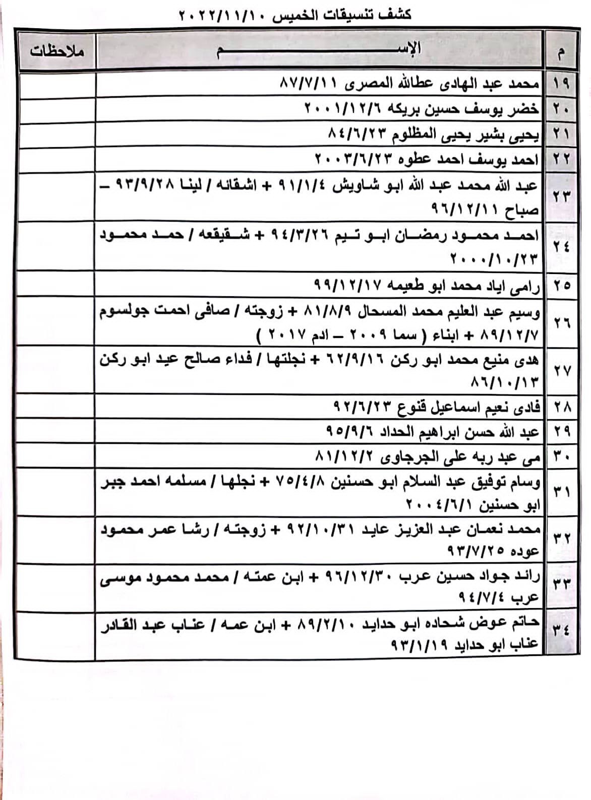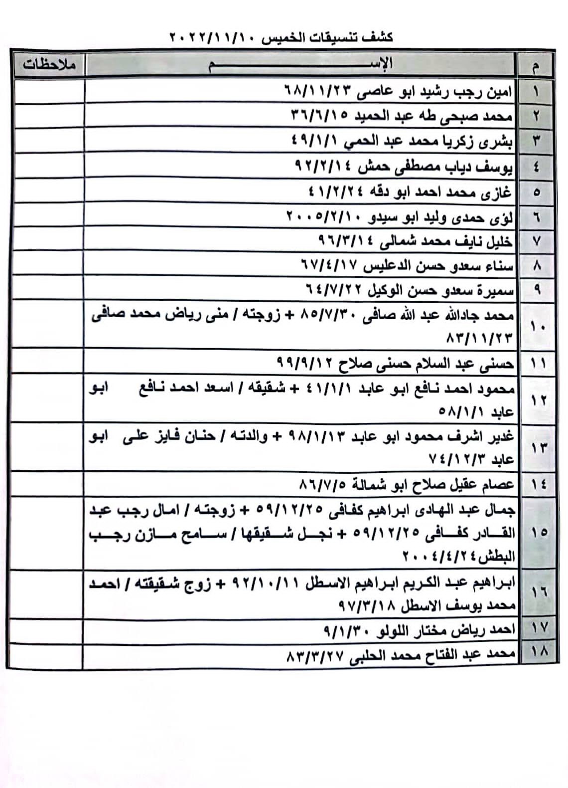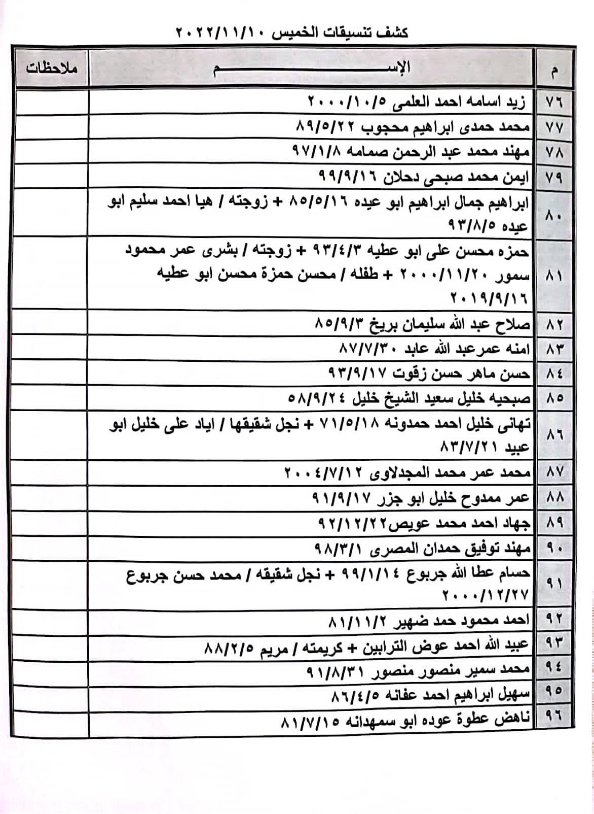 تعلن الهيئة العامة للمعابر والحدود بوزارة الداخلية والأمن الوطني عن وصول كشف "تنسيقات مصرية" للسفر عبر معبر رفح البري يوم الخميس (10 نوفمبر)، والذين عليهم التواجد س 7:00 صباحاً في الصالة الخارجية للمعبر لتسهيل سفرهم.