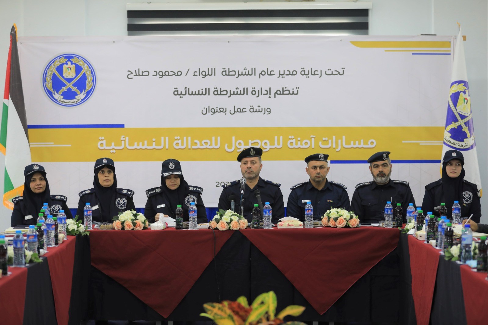 وعُقدت الورشة، التي جاءت بعنوان "مسارات آمنة للوصول للعدالة النسائية"، في قاعة الشهيد توفيق جبر بمقر قيادة الشرطة غرب مدينة غزة.