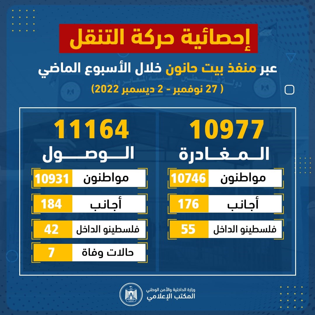وأوضحت الإحصائية أن إجمالي المغادرة عبر منفذ بيت حانون خلال الأسبوع الماضي بلغت 10977 مغادراً، فيما بلغ عدد الوصول 11164 وافداً.