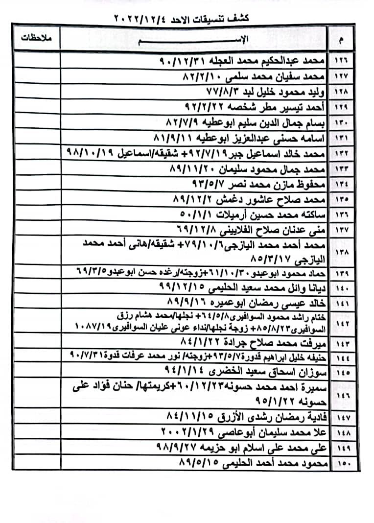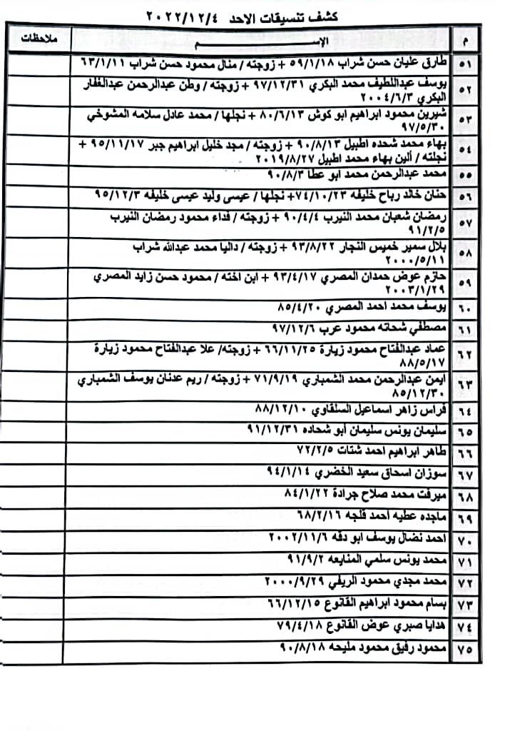 تعلن الهيئة العامة للمعابر والحدود بوزارة الداخلية والأمن الوطني عن وصول كشف "تنسيقات مصرية" للسفر عبر معبر رفح البري يوم غد الأحد (4 ديسمبر)، والذين عليهم التواجد س 7:00 صباحاً في الصالة الخارجية للمعبر لتسهيل سفرهم.