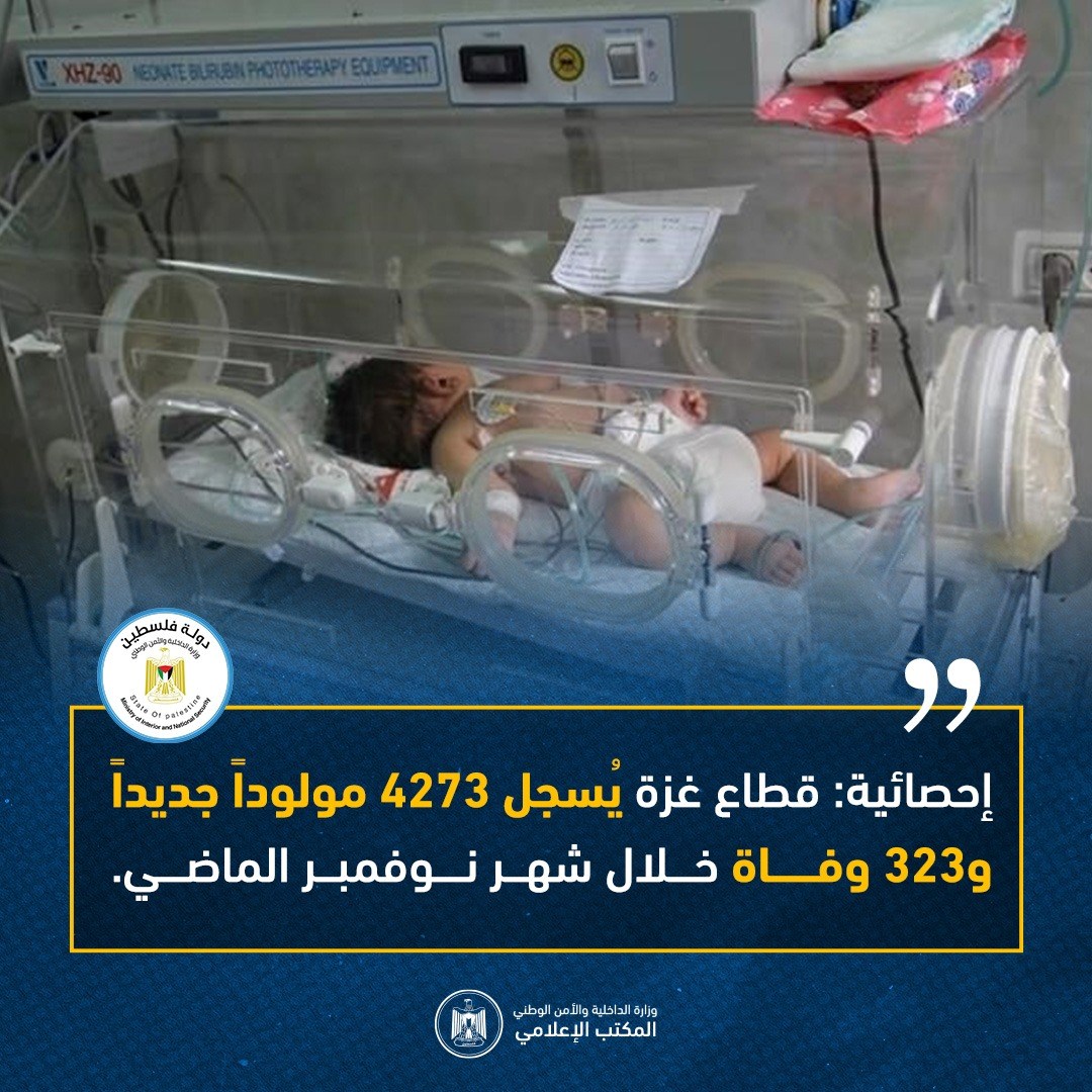أظهرت إحصائية صادرة عن الإدارة العامة للأحوال المدنية بوزارة الداخلية _ الشق المدني أن قطاع غزة سجَّل خلال شهر نوفمبر الماضي 4 آلاف و273 مولوداً جديداً، بالإضافة إلى تسجيل 323 حالة وفاة.