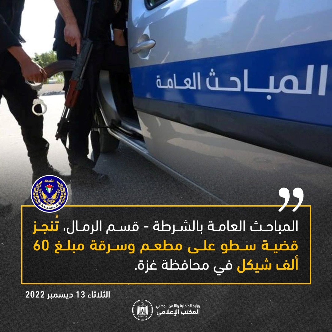 أنجزت المباحث العامة بالشرطة دائرة مباحث محافظة غزة - قسم الرمال، تفويض النيابة العامة حول شكوى المواطن (أ،ع) صاحب أحد المطاعم في المحافظة، مفادها قيام مجهول بالسطو على مطعمه وسرقة مبلغ مالي قيمته 60 ألف شيكل من خزنة بداخله.