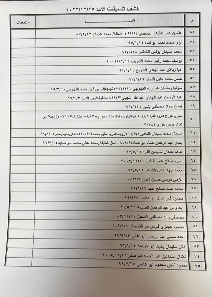 تعلن الهيئة العامة للمعابر والحدود بوزارة الداخلية والأمن الوطني عن وصول كشف "تنسيقات مصرية" للسفر عبر معبر رفح البري يوم الأحد (25 ديسمبر)، والذين عليهم التواجد س 7:00 صباحاً في الصالة الخارجية للمعبر لتسهيل سفرهم.