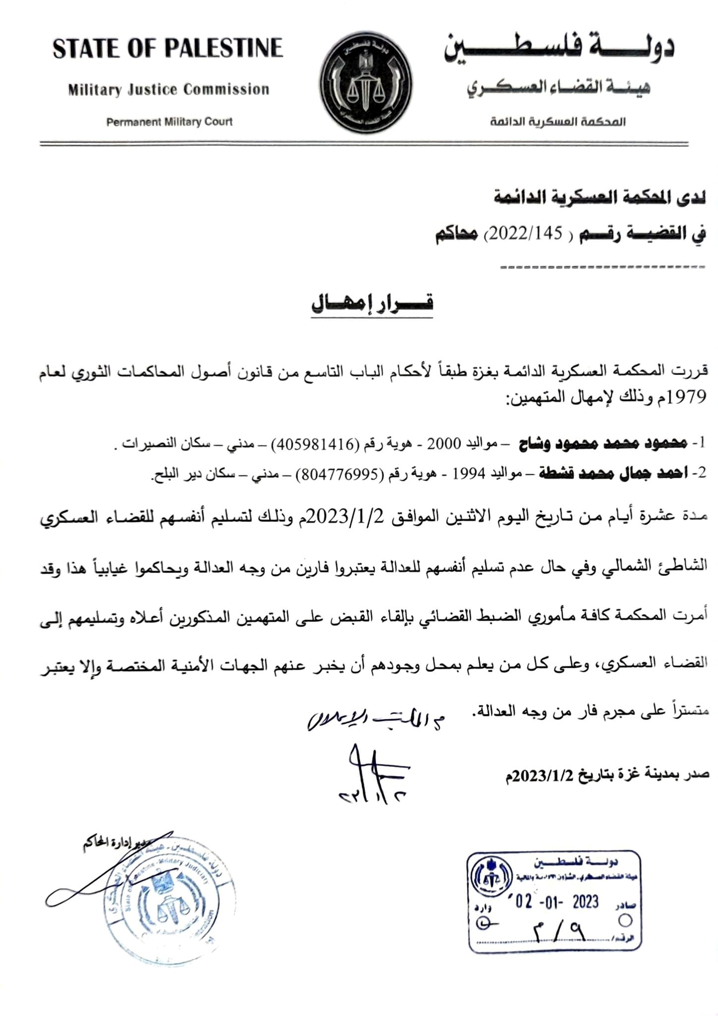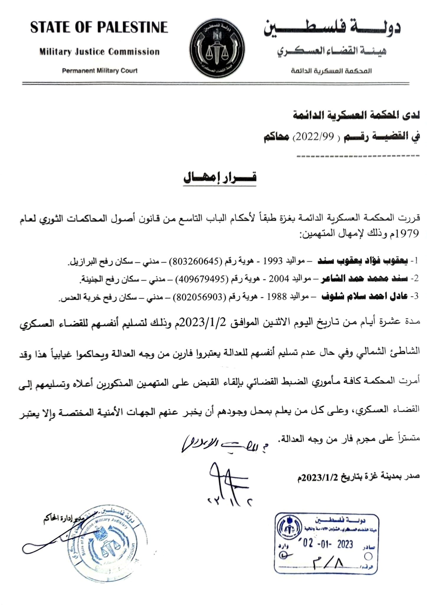 أمهلت المحكمة العسكرية الدائمة- التابعة لهيئة القضاء العسكري 5 متهمين عشرة أيام من تاريخ يوم الإثنين الموافق02/01/2023م، لتسليم أنفسهم للقضاء العسكري، والمتهمون هم: