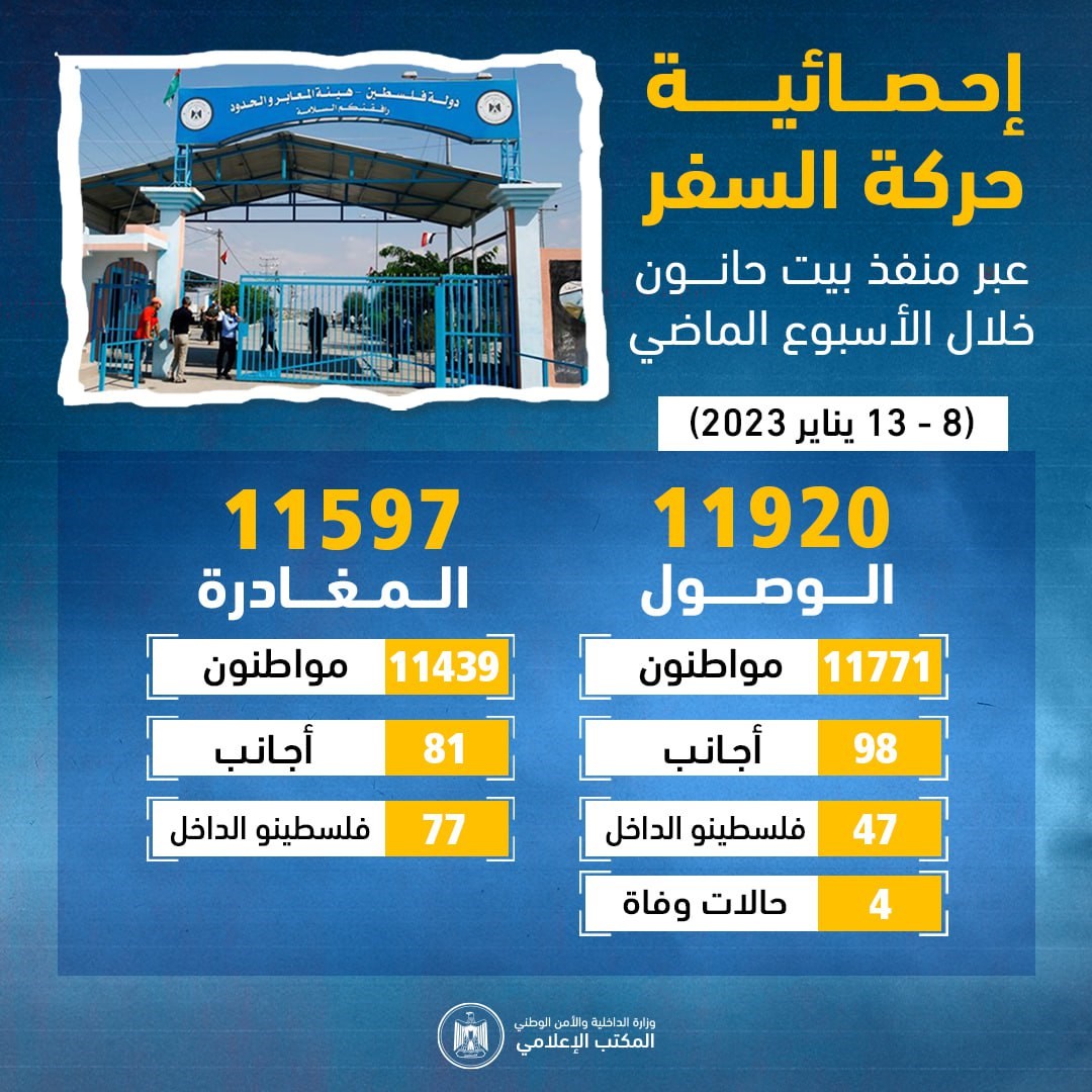 نشرت الهيئة العامة للمعابر والحدود بوزارة الداخلية والأمن الوطني، صباح السبت، إحصائية حركة التنقل عبر منفذ بيت حانون شمال قطاع غزة خلال الأسبوع الماضي (8-13 يناير 2023).