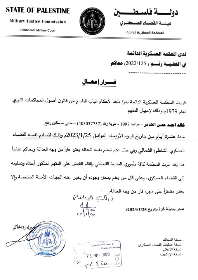 أمهلت المحكمة العسكرية الدائمة- التابعة لهيئة القضاء العسكري المتهم خالد أحمد حسن الشاعر، هوية رقم (403037757) سكان رفح، عشرة أيام من تاريخ اليوم الأربعاء الموافق 25/01/2023م، لتسليم نفسه للقضاء العسكري.