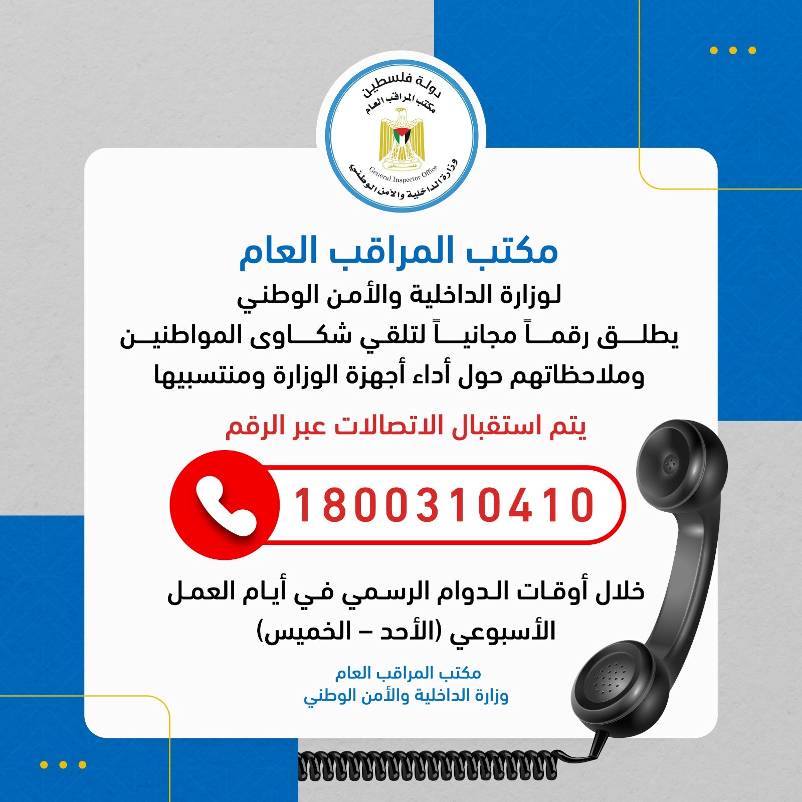 أطلق مكتب المراقب العام لوزارة الداخلية والأمن الوطني، رقماً مجانياً للتواصل المباشر مع المواطنين، وتلقّي شكاواهم وملاحظاتهم بشأن أداء أجهزة الوزارة ومنتسبيها، في القضايا ذات الاختصاص.