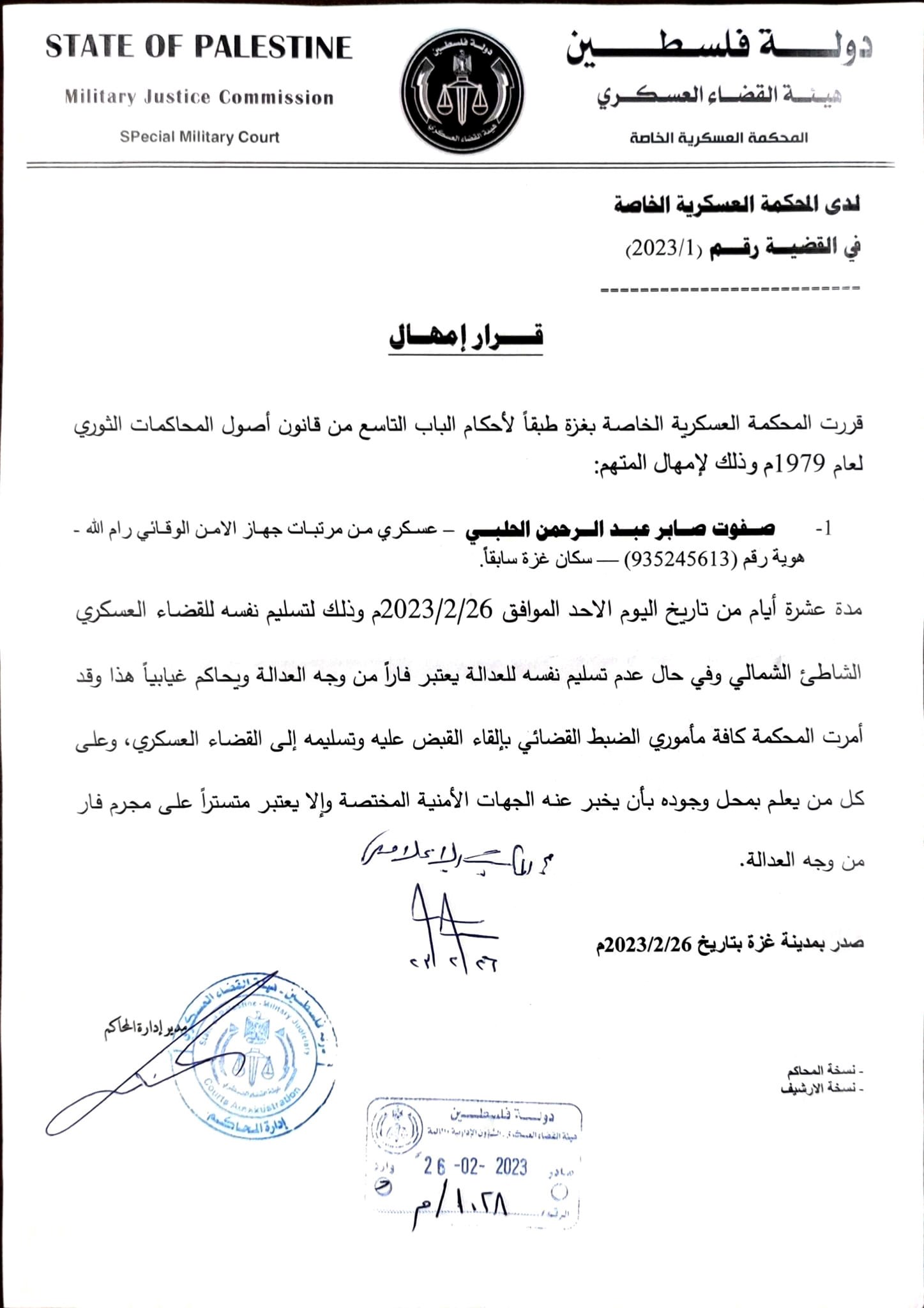 أمهلت المحكمة العسكرية الخاصة- التابعة لهيئة القضاء العسكري المتهم/صفوت صابر عبد الرحمن الحلبي، هوية رقم (935245613) سكان غزة سابقاً، عشرة أيام من تاريخ اليوم الأحد الموافق 26/02/2023م،