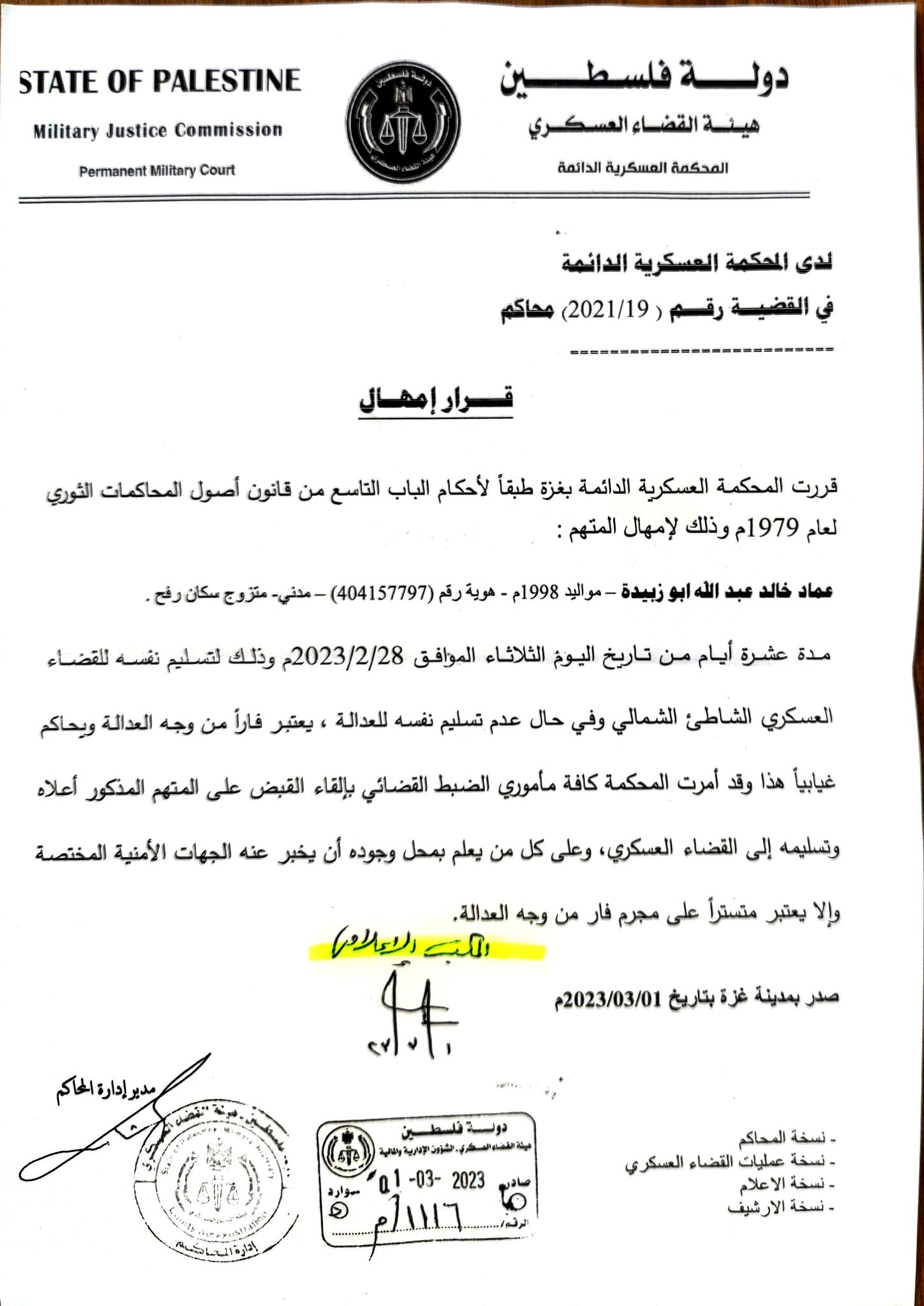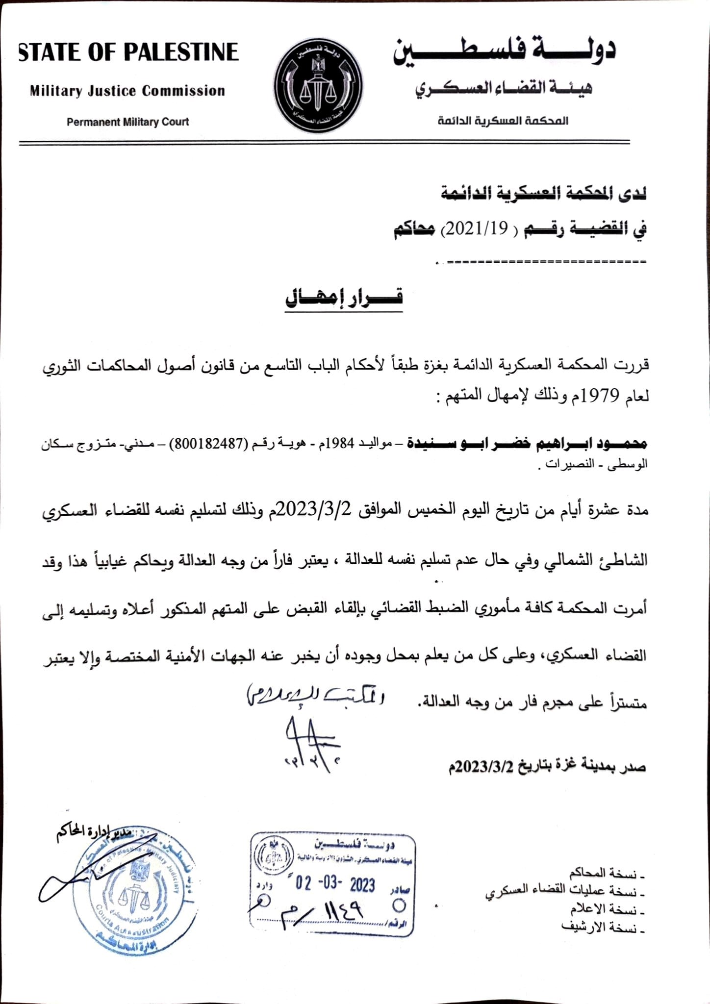 أمهلت المحكمة العسكرية الدائمة- التابعة لهيئة القضاء العسكري المتهم عماد خالد عبد الله أبو زبيدة، هوية رقم (404157797) سكان رفح، والمتهم محمود إبراهيم خضر أبو سنيدة، هوية رقم (800182487) سكان النصيرات، عشرة أيام من تاريخ اليوم الخميس الموافق 02/03/2023م، لتسليم نفسه للقضاء العسكري.