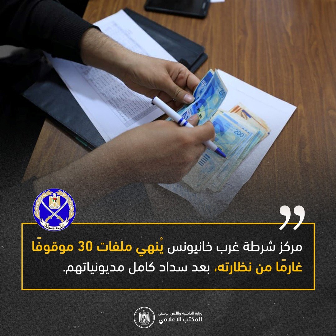 أنهى مركز شرطة غرب خان يونس ملفات 30 غارمًا من الموقوفين في نظارته على ذمم مالية وذلك ضمن مبادرة "فكاك الغارمين" بتبرع من فاعل خير.