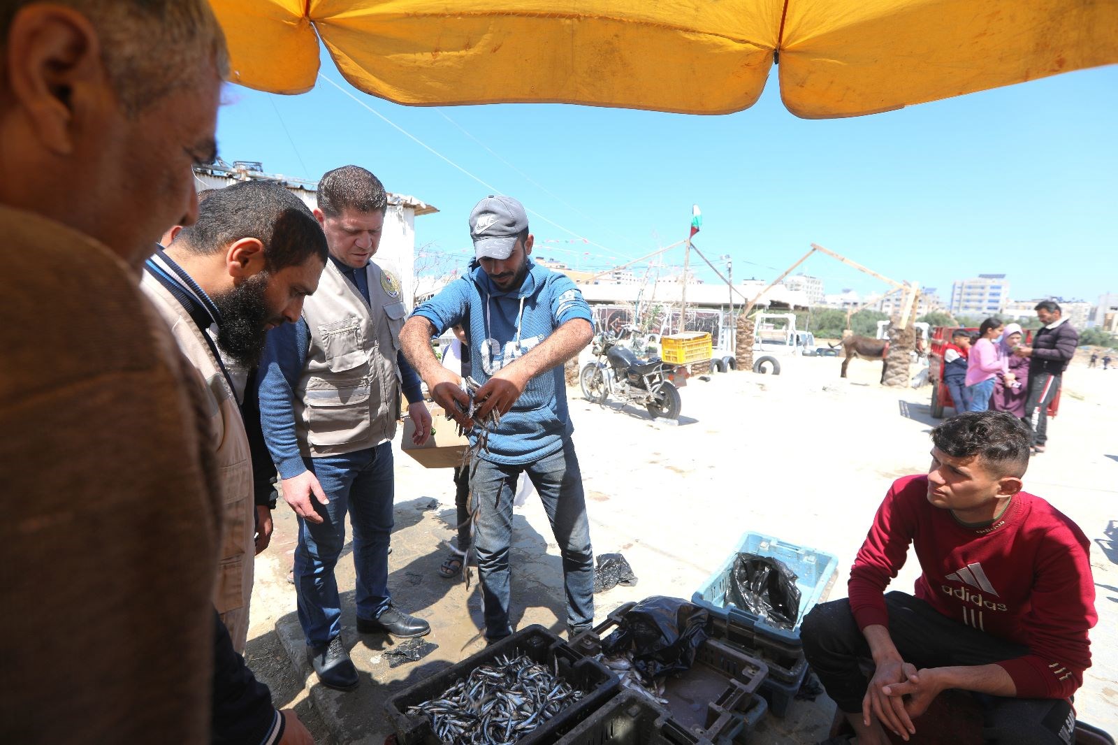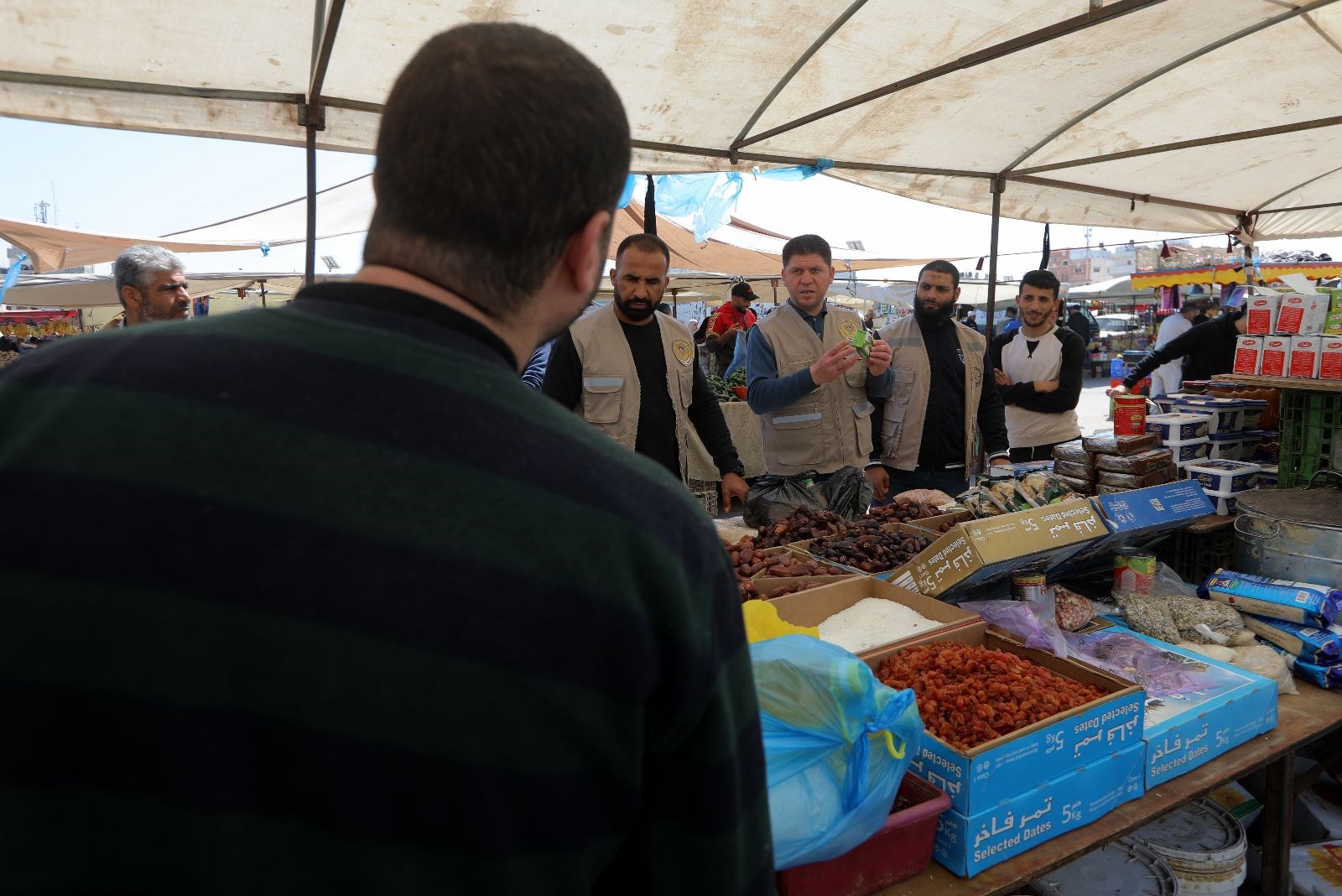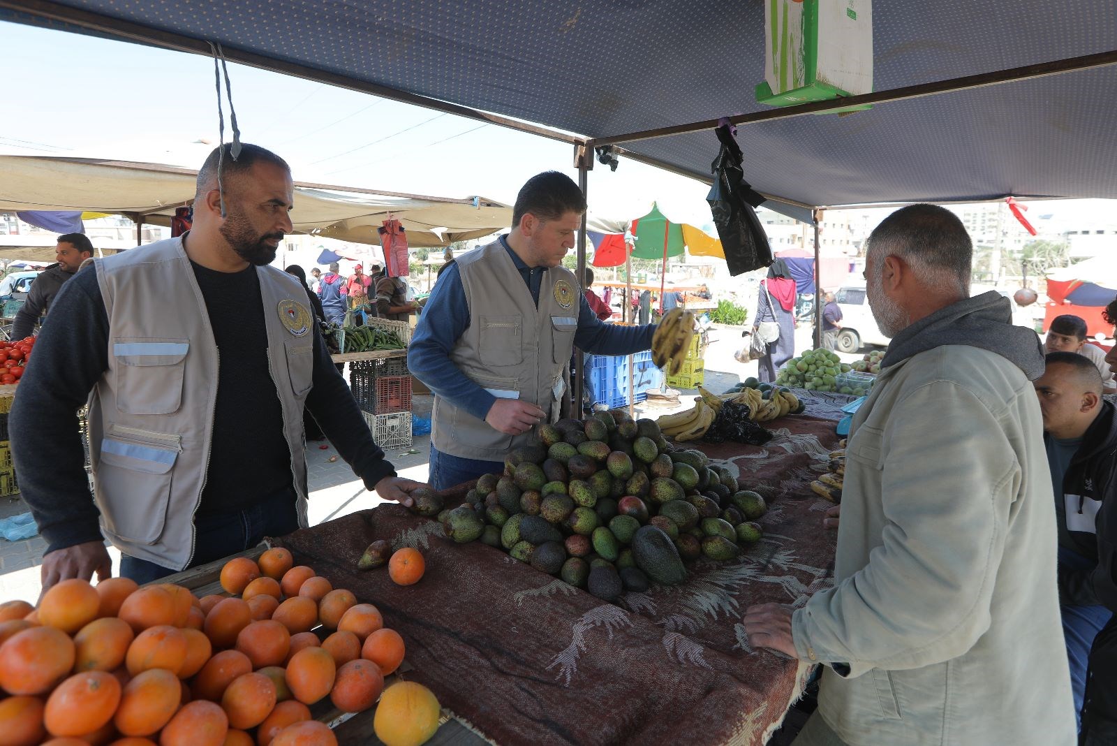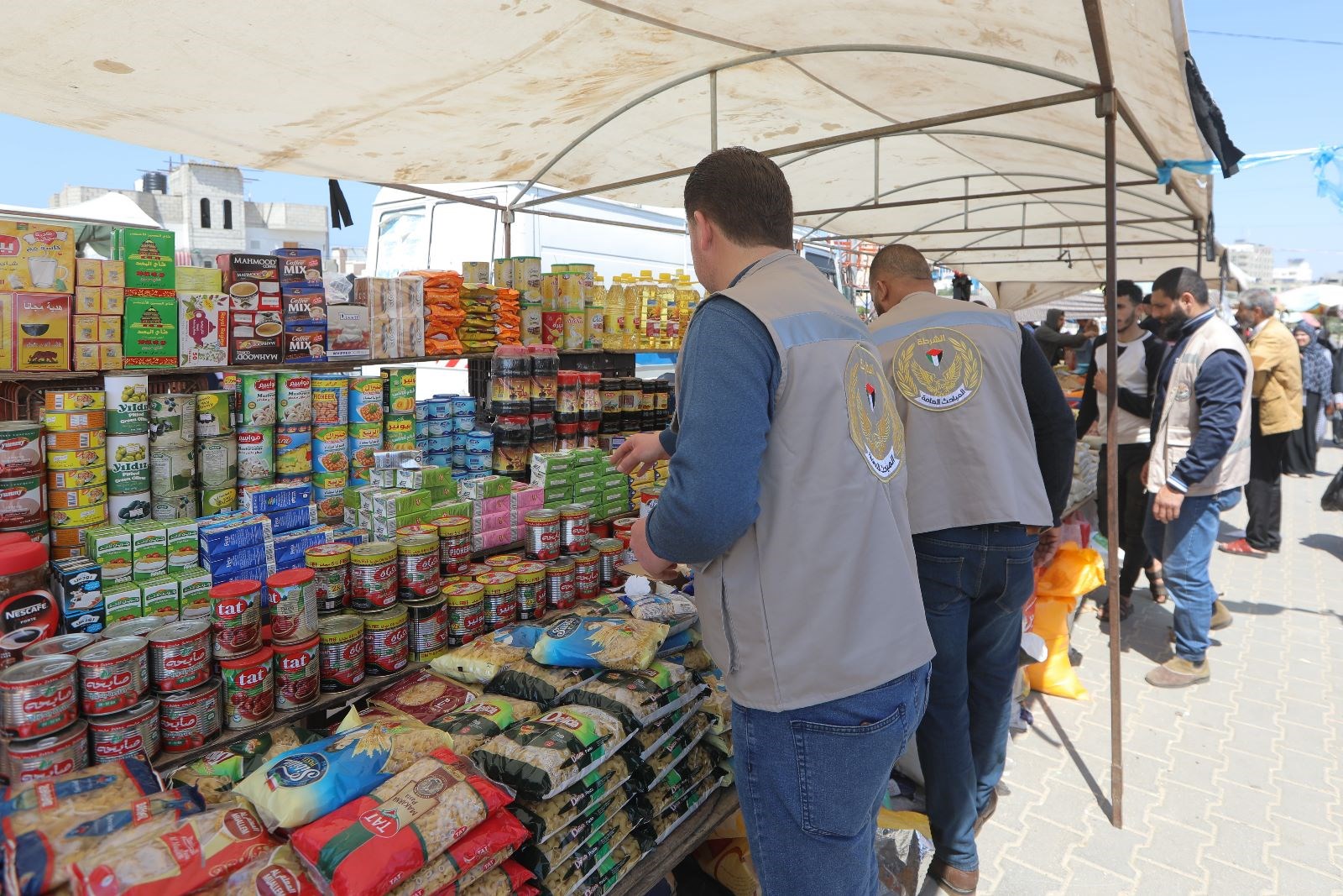 جانب من الجولات التفتيشية لدائرة مباحث التموين بالشرطة، على الأسواق والتجار والمولات التجارية في قطاع غزة؛ لمتابعة توفر السلع الغذائية ومراقبة الأسعار ومنع الاستغلال والاحتكار.