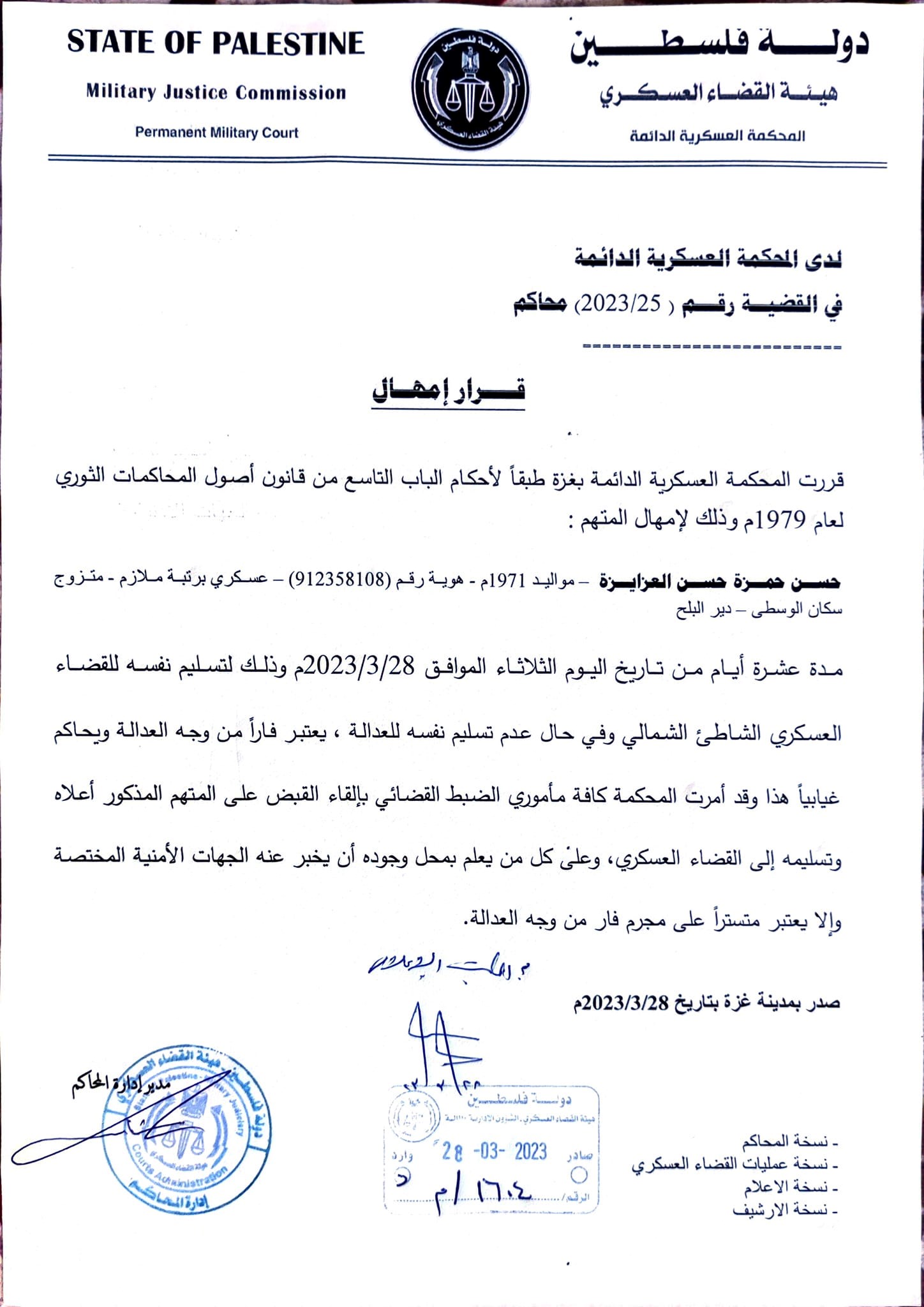 أمهلت المحكمة العسكرية الدائمة التابعة لهيئة القضاء العسكري المتهم حسن حمزة حسن العزايزة، هوية رقم (912358108) سكان الوسطى دير البلح، عشرة أيام من تاريخ يوم الثلاثاء الموافق 28/03/2023م، لتسليم نفسه للقضاء العسكري.