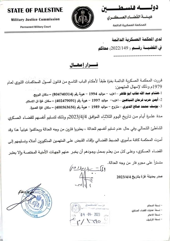 أمهلت المحكمة العسكرية الدائمة- التابعة لهيئة القضاء العسكري المتهم هشام عبدالله عقاب أبو ظاهر، هوية رقم (804740314)، سكان البريج، والمتهم أيمن حرب فرحان النباهين، هوية رقم (402479091)، سكان غزة-تل الهوى، والمتهم يوسف محمد صالح الديري، هوية رقم (400563656)، سكان غزة-الصبرة عشرة أيام من تاريخ اليوم الثلاثاء الموافق 04/04/2023 لتسليم أنفسهم للقضاء العسكري.