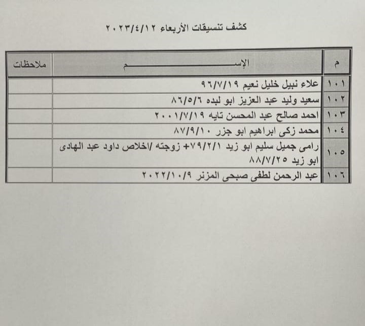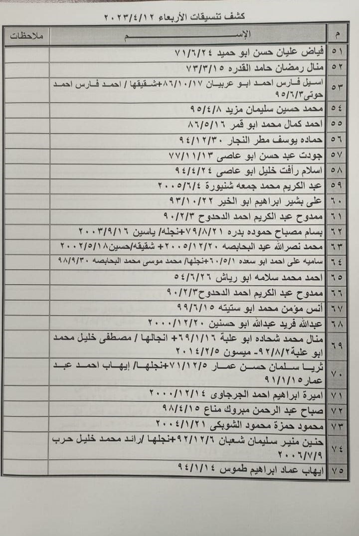 تعلن الهيئة العامة للمعابر والحدود بوزارة الداخلية والأمن الوطني عن وصول كشف "تنسيقات مصرية" للسفر عبر معبر رفح البري يوم الأربعاء (12 أبريل)، والذين عليهم التواجد س 7:00 صباحاً في الصالة الخارجية للمعبر لتسهيل سفرهم.