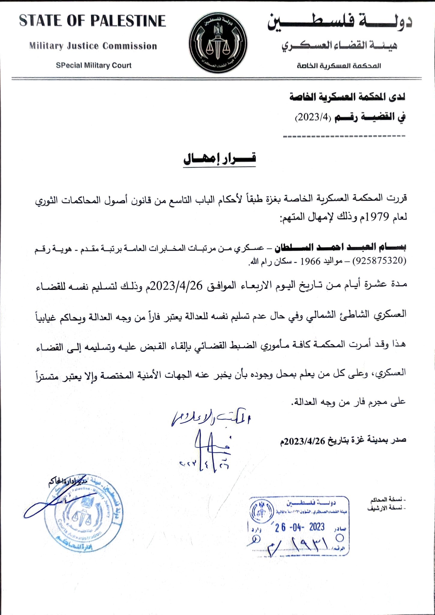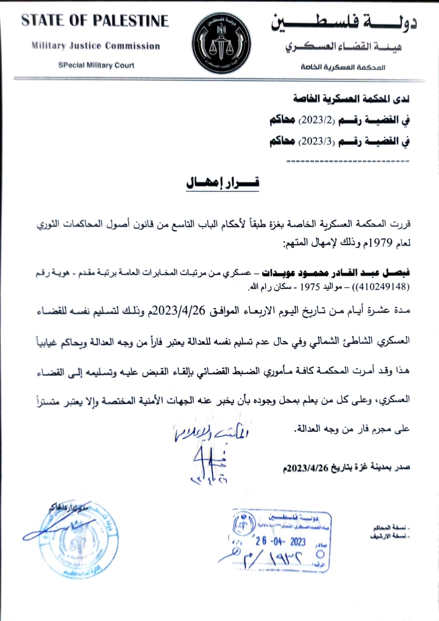 أمهلت المحكمة العسكرية الخاصة التابعة لهيئة القضاء العسكري المتهم بسام العبد أحمد السلطان، هوية رقم (925875320) سكان رام الله، عشرة أيام من تاريخ يوم الاربعاء الموافق 26/04/2023م، والمتهم فيصل عبد القادر محمود عويدات، هوية رقم (410249148) سكان رام الله، عشرة أيام من تاريخ يوم الاربعاء الموافق 26/04/2023م، لتسليم نفسيهما للقضاء العسكري.