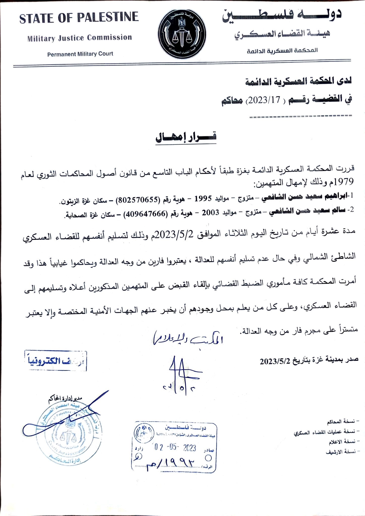 أمهلت المحكمة العسكرية الدائمة- التابعة لهيئة القضاء العسكري المتهم إبراهيم سعيد حسن الشافعي، هوية رقم (802570655)، سكان غزة-الزيتون، والمتهم سالم سعيد حسن الشافعي، هوية رقم (409647666)، سكان غزة-الصحابة، عشرة أيام من تاريخ يوم الثلاثاء الموافق02/05/2023م، لتسليم نفسيهما للقضاء العسكري.