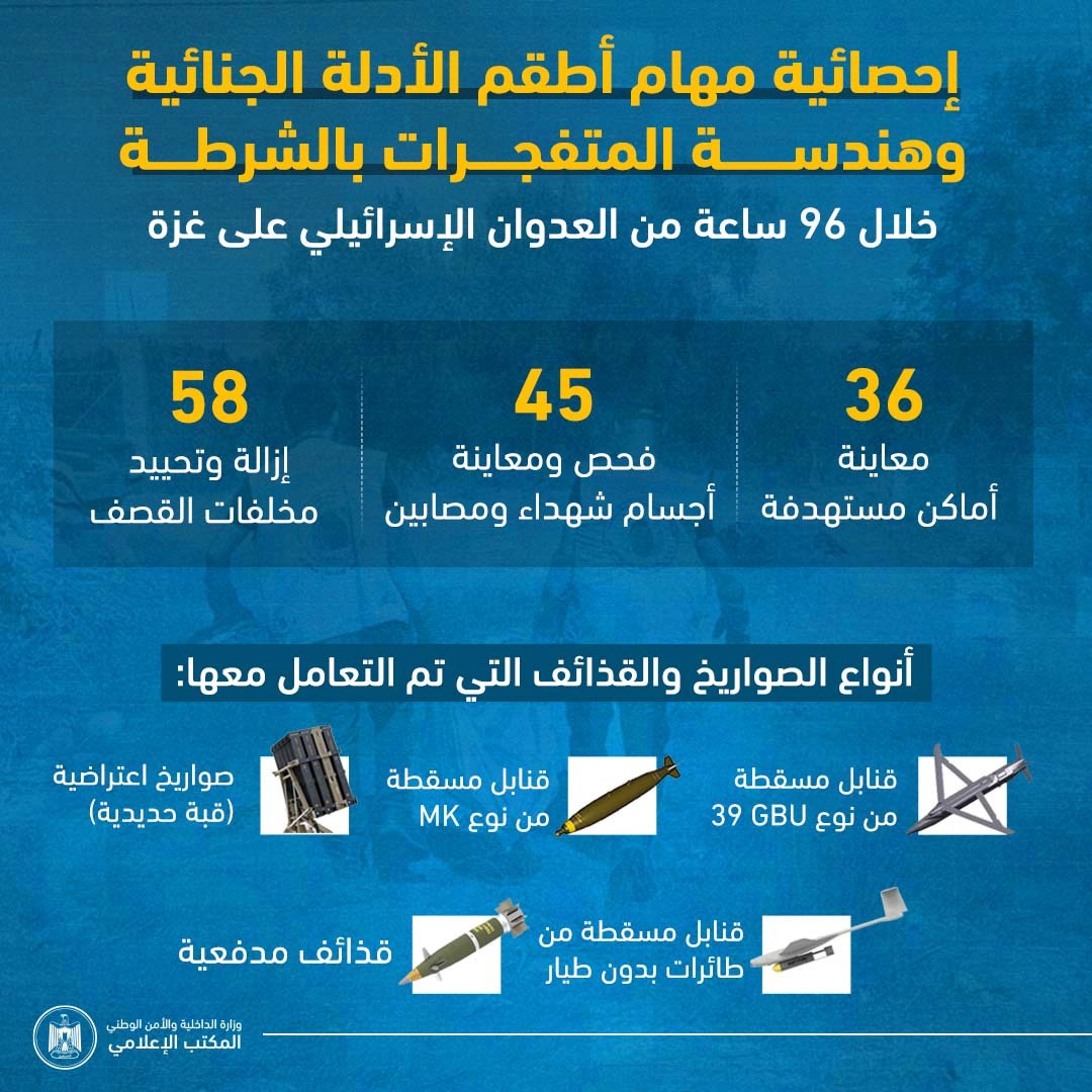 إنفوجراف مهام إدارة الأدلة الجنائية وهندسة المتفجرات بالشرطة في متابعة آثار العدوان الإسرائيلي على قطاع غزة، خلال (96) ساعة من العدوان: