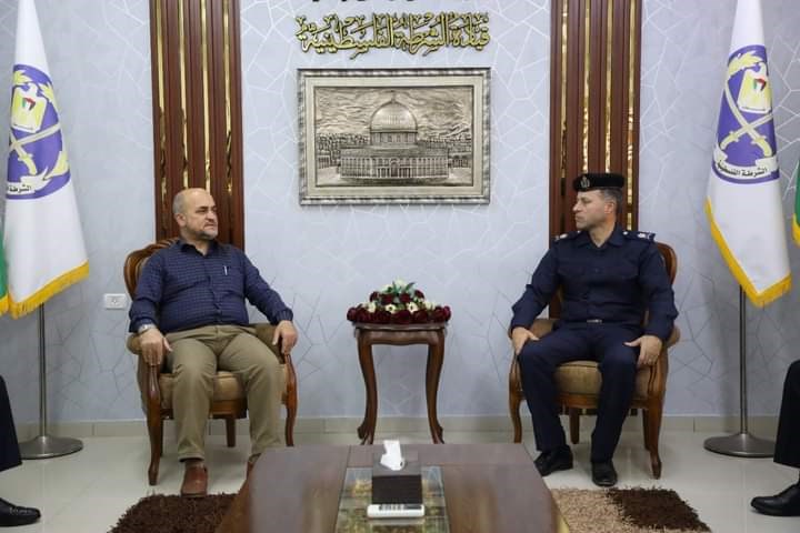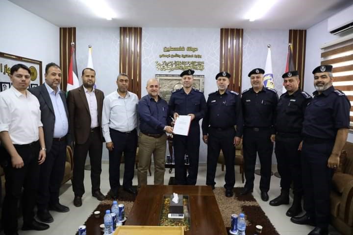 سلم المُراقب العام لوزارة الداخلية والأمن الوطني اللواء ماهر بنات، مدير عام الشرطة اللواء محمود صلاح التقرير الرقابي الشامل الخاص بشرطة المحافظة الوسطى خلال زيارته في مكتبه بمدينة عرفات للشرطة بغزة.