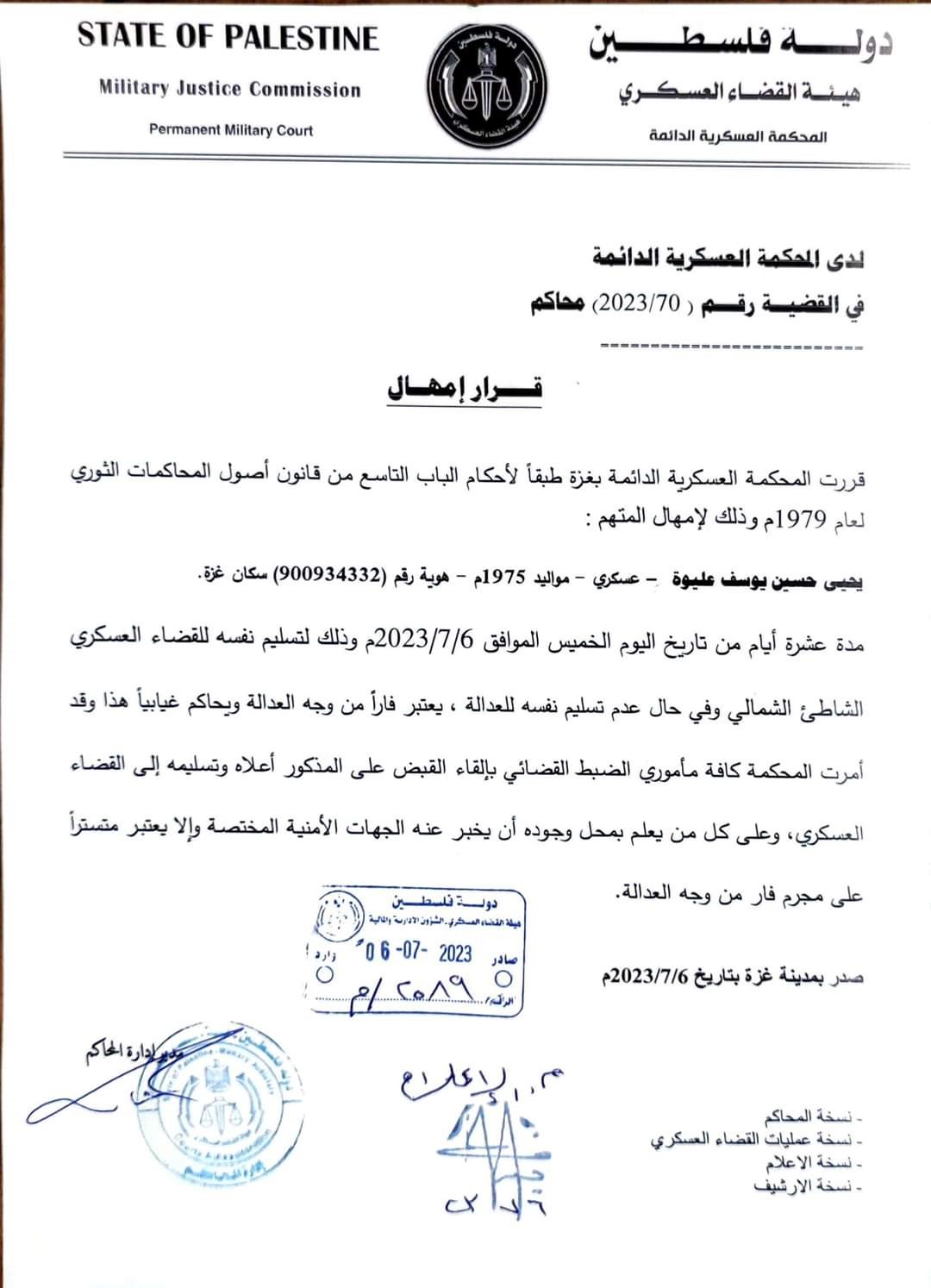 أمهلت المحكمة العسكرية الدائمة- التابعة لهيئة القضاء العسكري المتهم/يحيى حسين يوسف عليوة، هوية رقم (900934332) سكان غزة، عشرة أيام من تاريخ اليوم الخميس الموافق 06/07/2023م، لتسليم نفسه للقضاء العسكري.