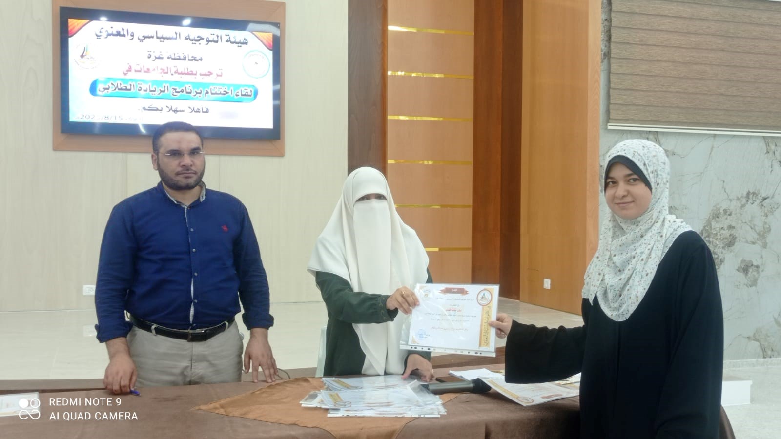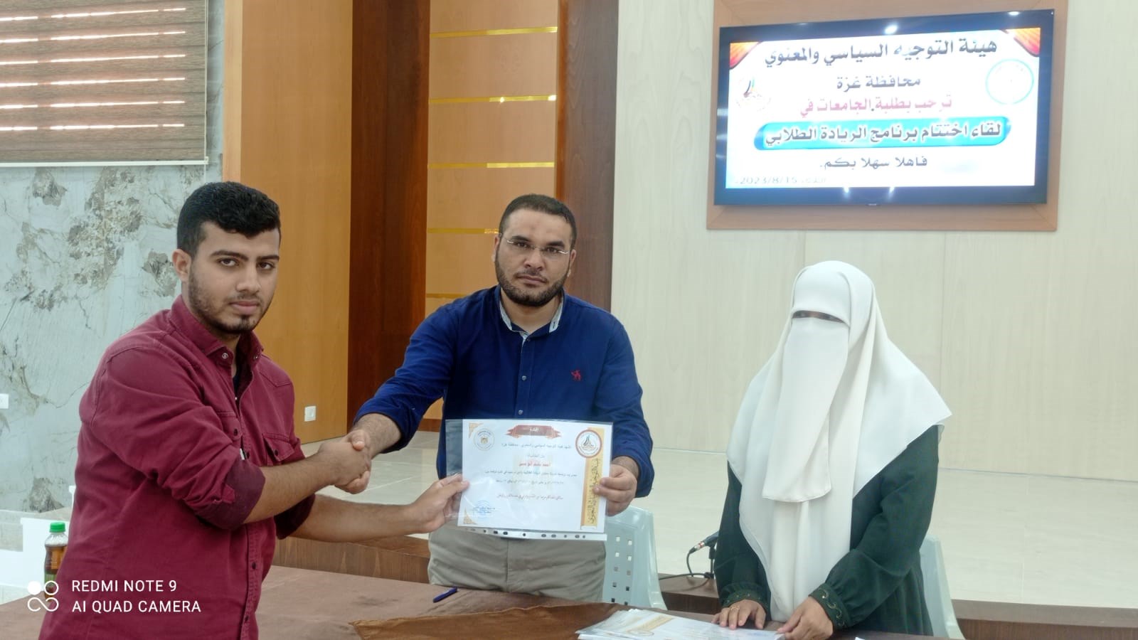 اختتمت هيئة التوجيه السياسي والمعنوي بمحافظة غزة برنامج الريادة الطلابي والذي طلبة الجامعات بواقع 12ساعة تدريبية.