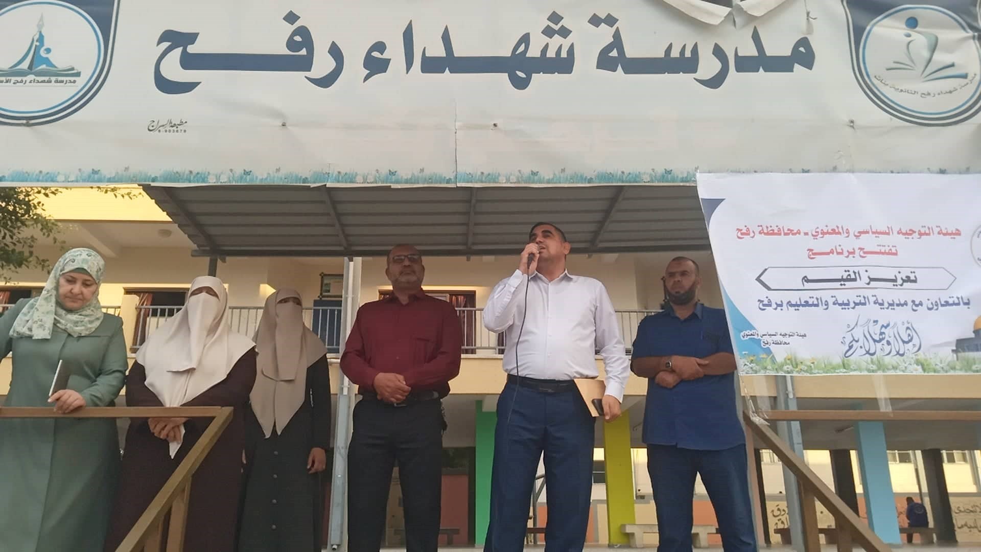 أطلقت هيئة التوجيه السياسي والمعنوي بالتعاون مع وزارة التربية والتعليم برنامجاً توعوياً بعنوان: "غرس وتعزيز القيم" لطلبة مدارس المرحلة الثانوية بجميع محافظات قطاع غزة.
