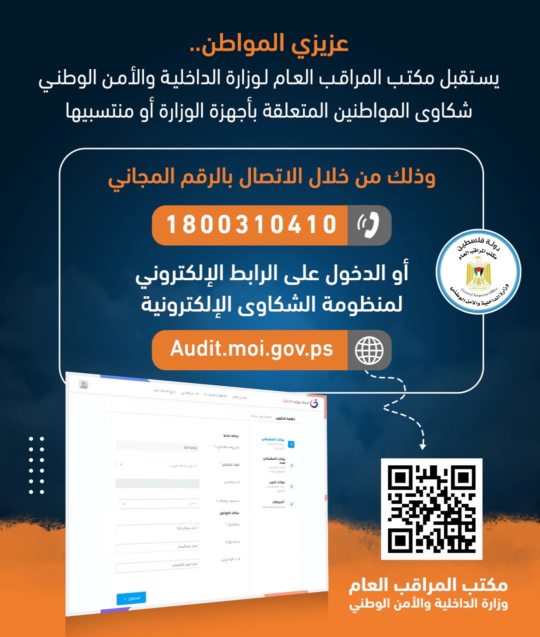 - وبإمكان المواطنين الوصول إلى الخدمة من خلال بوابة الخدمات الإلكترونية "التسجيل الموحد" عبر الرابط https://audit.moi.gov.ps