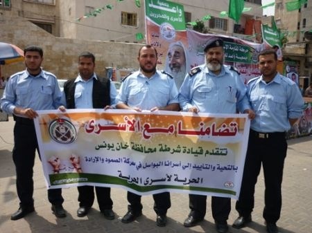 Des membres de relations publiques auprès la police palestinienne et l'association de l'orientation politique et moral à Khan Younis ont participé dans un festival de solidarité avec les détenus qui mènent une grève de la faim pour le 19 jours .La délégation comprend le major Nidal Kollab et un certain nombre des officiers de police et de la securité nationale .Le major avait affirmé que cette participation vient dans le cadre de soutient les détenus qui rejettent l'oppression mené par l'administration pénitentiaire sioniste .