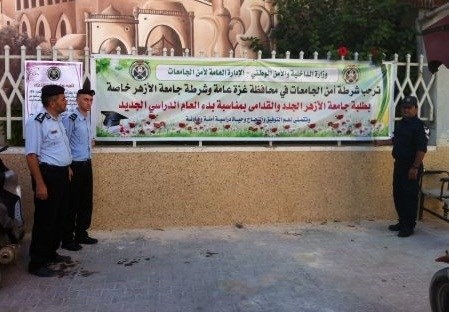 قامت شرطة أمن جامعة الأزهر والمعهد الديني بطباعة وتعليق العديد من البوسترات داخل جامعة الأزهر بغزة بمناسبة بدء العام الدراسي الجديد .