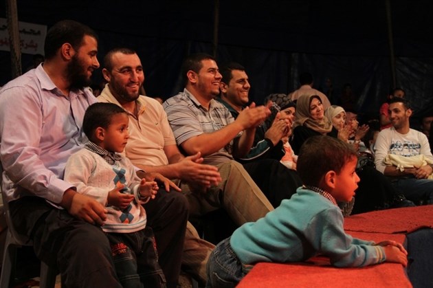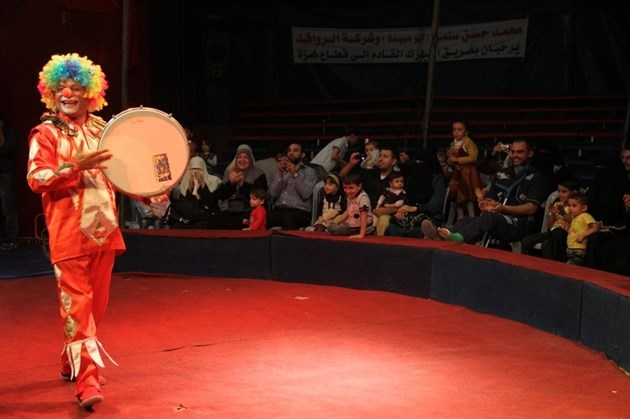 وعبر الجريح الفلسطيني عن بالغ سعادته وأطفاله وأهله بالعروض الشيقة التي تابعها في السيرك الذي يعرض لأول مرة في القطاع.