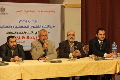 وكان المكتب الإعلامي الحكومي قد نظم اللقاء بحضور رئيس المكتب م. إيهاب الغصين ووكيل وزارة الشئون الاجتماعية مصطفى الصواف والناطق باسم الحكومة الفلسطينية طاهر النونو، ولفيف من الكتاب والنخب والصحفيين .