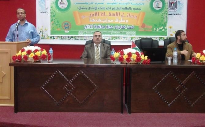عقدت هيئة التوجيه السياسي والمعنوي في محافظة خانيونس جنوب قطاع غزة بالتعاون مع مديرية التربية والتعليم غرب خان يونس ندوة أمنية بعنوان "وسائل الإسقاط الأمني وطرق مواجهتها والوقاية منها".