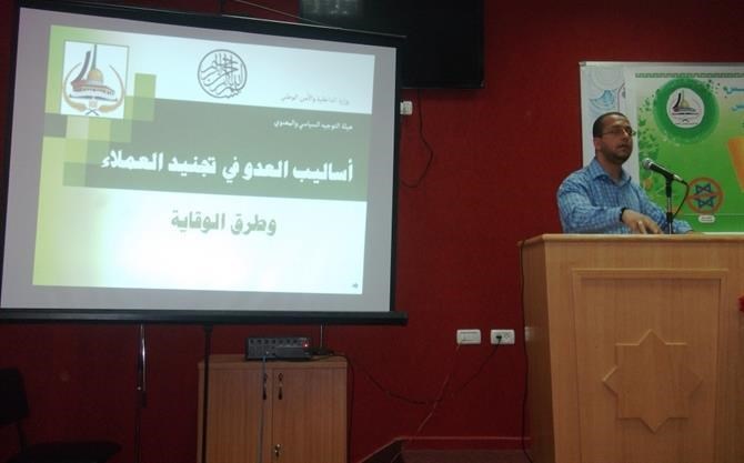 وألقى الندوة ضابط في جهاز الأمن الداخلي بالمحافظة وقدّمه الأستاذ محمد العبادلة من هيئة التوجيه السياسي بخان يونس.