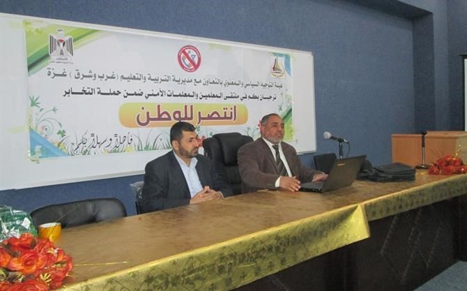 نظمت هيئة التوجيه السياسي والمعنوي بغزة بوزارة الداخلية والأمن الوطني محاضرة أمنية لمعلمي ومعلمات شرق غزة ضمن حملة التثقيف التي استهدفت المعلمين حول موضوع التخابر مع الاحتلال الصهيوني حيث استضافت بها الدكتور كمال تربان عميد أكاديمية فلسطين للعلوم الأمنية.