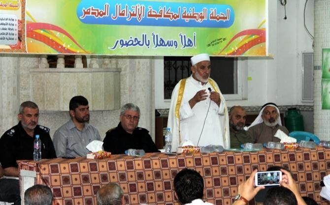 الوسطى / الداخلية / وليد شكوكاني: أكَّد النائب في المجلس التشريعي ورئيس رابطة علماء فلسطين د.يونس الأسطل أن تجار ومروجي المخدرات يحاربون الله ورسوله فضلاً عن أنهم مفسدون في الأرض. جاء ذلك خلال لقاءٍ عقدته أسرة مسجد البلد القديم مع رئاسة الحملة الوطنية لمكافحة الأترمال المدمر بحضور عامة الناس مساء أمس السبت بمدينة دير البلح وسط القطاع. أحكام عالية وحضر اللقاء رئيس الحملة العقيد كمال أبو ندى ومحافظ الوسطى المقدم فؤاد أبو بطيحان ومدير مديرية أوقاف المحافظة الوسطى أ.محمد سالم ورئيس بلدية دير البلد أ.سعيد نصار بالإضافة إلى لفيف من قادة حماس في مدينة دير البلح. وتحدث الأسطل عن التأصيل الشرعي لحكم المخدرات بشكلٍ عام والأترمال المدمر بشكلٍ خاص لافتاً إلى أن الشرع جاءَ ليشدد على كل ما يُزيل العقل جزئياً أو كلياً. وأوضح أن " الله عز وجل اختص الإنسان بالعقل وإذا زال فقَدَ ذلك الإنسان أسباب كرامته كآدمي وتدلى إلى درك البهيمية " حسب وصفه. وحذَّر رئيس رابطة علماء فلسطين مروجي ومتعاطي الأترمال من الانغماس أكثر في تلك المحظورات الخطيرة مؤكداً أن الإصرارَ على المضي في طريقها سيكونُ وبالاً في الدنيا والآخرة. وتطرق إلى الآثار والمفاسد الدينية والدنيوية التي تتركها المخدرات على المُتعاطي ناصحاً كل مسلم إلى الانتباه من خطرها حتى لا يقع في محظورٍ لا يُحمد عقباه. وشدد على عزم المجلس التشريعي سنَّ قانون جديد سيتم من خلاله إنزال أقصى العقوبات بحق تجار ومروجي المخدرات منوهاً أن القانون سيحتوي أحكـام عالية جداً لمن ثبت عليه الإتجار بالمخدرات تصل إلى حد " الإعدام ". استهداف واضح بدوره قال العقيد كمال أبو ندى إن " المسألة باتت خطيرة جداً لأن كل بيت في القطاع غير آمن لأن العدو الصهيوني يسخر كل طاقاته في سبيل استهداف كافة شرائح المجتمع الفلسطيني بما فيها الفئة الصالحة ". ولفت إلى أن الوسيلة الوحيدة لمجابهة هذه الآفة تكمن في وعي وتربية الفرد ذاته " دينياً ووطنياً " , مشدداً أن المسؤولية ليست منوطة بوزارة الداخلية فقط بل هي ملقاة على عاتق الجميع. وبيَّن أن للأهل دورٌ مهم في الحد من هذه الآفة من خلال متابعة أبنائهم ومراقبتهم وإبلاغ الجهات المعنية في حال ملاحظتهم لأي تغيرات تنجم عن تعاطيهم لأي نوع من أنواع المخدرات وبالتحديد " الأترمال " المدمر. وأبدى استعداد رئاسة الحملة وشرطة مكافحة المخدرات لاستقبال ومساعدة أي شخص ينوي التوبة والخروج من مستنقع المخدرات. وأسدى أبو ندى بعض النصائح والإرشادات الهامة للحضور خشية أن يقع أحدٌ منهم أو من أبنائهم وأهلهم في براثن المخدرات المهلكة داعياً إياهم إلى الإبلاغ عن أي شخص يحاول نشر الحبوب المخدرة بين أوساط الشباب. من جانبه أعرب أ.محمد سالم مدير مديرية أوقاف الوسطى عن سعادته البالغة بهذه الحملة مؤكداً أن وزارة الأوقاف لن تدّخر جهداً في سبيل نجاحها. ودعا الجميع إلى توعية الأهل والأبناء وتبصيرهم بخطر هذا العقار القاتل محملاً الاحتلال الصهيوني مسؤولية المحاولات المستمرة لتدمير الجيل والفتك به.