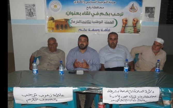 غزة / الداخلية / اعلام التوجيه نظمت هيئة التوجيه السياسي والمعنوي في محافظة رفح جنوب قطاع غزة ملتقى عائلي لعائلة زعرب ضمن الحملة الوطنية لمكافحة الأترامال المدمر. وحضر الملتقى الرائد عادل زعرب مسئول العلاقات العامة في شرطة المدينة والنقيب أحمد رصرص مسئول قسم الإرشاد الديني في الهيئة ومختار عائلة زعرب أحمد زعرب ولفيف من أفراد ووجهاء العائلة. وتحدث الرائد زعرب والنقيب رصرص عن الأترامال المدمر وخطره على النفس والمجتمع وعن دور الأهل والعائلة في محاربة هذه الظاهرة. وأشارا أهداف هذه الحملة والتي هي بالأساس أهداف تربوية تثقيفية الغرض منها حماية الشعب عامة والشباب خاصة من الوقوع في براثن هذا الخطر.