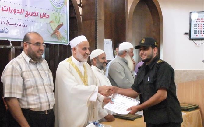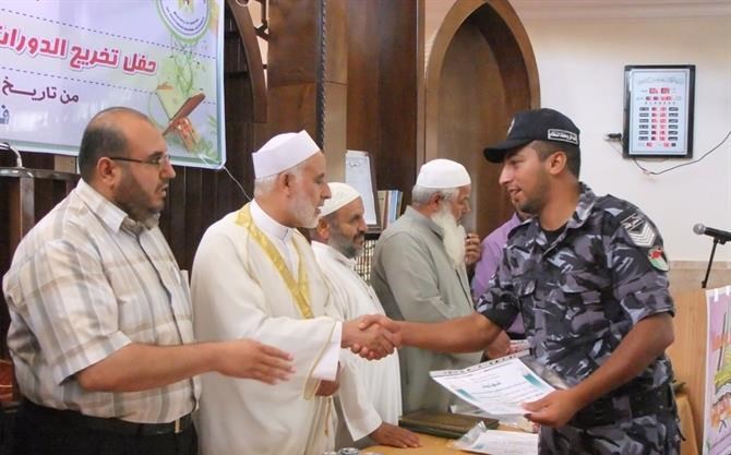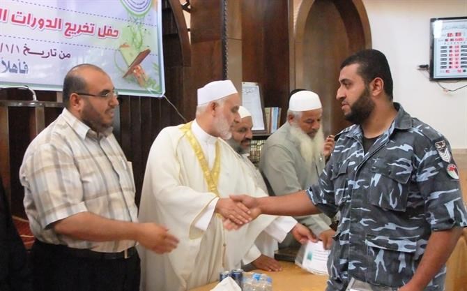 خانيونس / الداخلية / إعلام التوجيه السياسي: نظمت هيئة التوجيه السياسي والمعنوي بمحافظة خان يونس حفلاً لتخريج الدورات الشرعية ودورات أحكام التلاوة والتجويد التي نفذتها من بداية العام الحالي حتى نهاية شهر يونيو المنصرم. واستهدفت هذه الدورات أكثر من (250) ضابطًا وفردًا من أبناء الأجهزة الأمنية، وتنوعت عناوين وموضوعات الدورات مثل (العقيدة الإسلامية، السيرة النبوية، نضرة النعيم في أخلاق الرسول الكريم، تزكية الأنفس، ودورات أحكام التلاوة والتجويد التأهيلية والعليا وتأهيل السند)، إضافةً إلى دورات التنمية البشرية الواقعة في الفترة المذكورة أعلاه وهي (دورة القيادة الإسلامية، ودورة فن التعامل مع الجمهور). وتحدث ضيف الحفل النائب في المجلس التشريعي الفلسطيني الدكتور يونس الأسطل عن آخر المستجدات وتداعيات الوضع المصري على الساحة المصرية والعربية والعالمية. ومن ثم تحدّث عن أهمية دورات القرآن الكريم، وأهميتها في بناء الجيل القرآني وتأسيس جيل النصر والعودة. وقال إن بناء العقيدة والدين في نفوس الرجال لهو أهم من حملهم السلاح. وفي نهاية كلمته شكر هيئة التوجيه السياسي والمعنوي والقائمين على هذا الحفل وهذه الدورات الرائعة والمشرفة، كما وشكر وزارة الداخلية التي تشرف على كل هذه الأنشطة والفعاليات وتوفر الجو والمناخ المناسب لها. وتم استعراض نموذجين من الإخوة الذين شاركوا في دورات أحكام التلاوة من الذين أنهوا دورة تأهيلية وعليا، حيث قرأ كلٌ منهما ما تيسر من القرآن الكريم أمام الحضور. وأتحف الحضور الأخ المنشد محمد عماد العبادلة بأنشودة رائعة، ومن ثم كرم مدير مكتب خان يونس الرائد إسماعيل الأسطل، والنائب الأسطل، ومدير أوقاف خان يونس السابق الشيخ سعيد زعرب الإخوة المشاركين في الدورات المذكورة حيث سلموهم شهادات التقدير الخاصة بهم كلٌ حسب دورته التي أنهاها.
