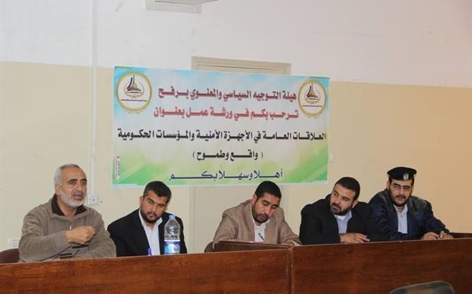 أقامت هيئة التوجيه السياسي والمعنوي بوزارة الداخلية والأمن الوطني بمحافظة رفح ورشة عمل بعنوان " العلاقات العامة في الأجهزة الأمنية والمؤسسات الحكومية واقع وطموح ".