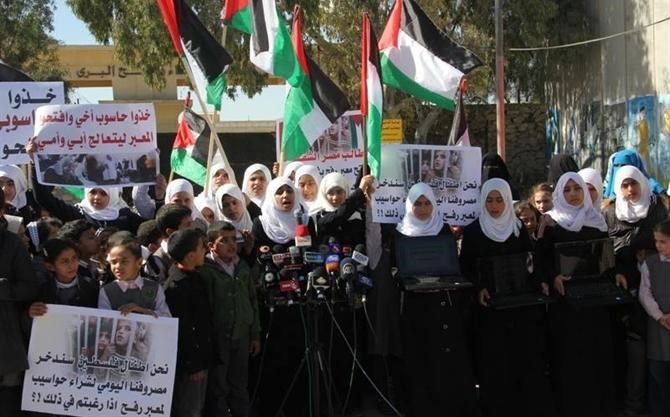 وقال أحد الطلاب المشاركين: "خذوا حاسوب أخي وافتحوا المعبر ليتعالج أبي وأمي، خذوا حاسوبي وأعطوني حريتي، وسنتبرع لكم بمصروفنا القليل لتشتروا حواسيب جديدة ليعمل المعبر".