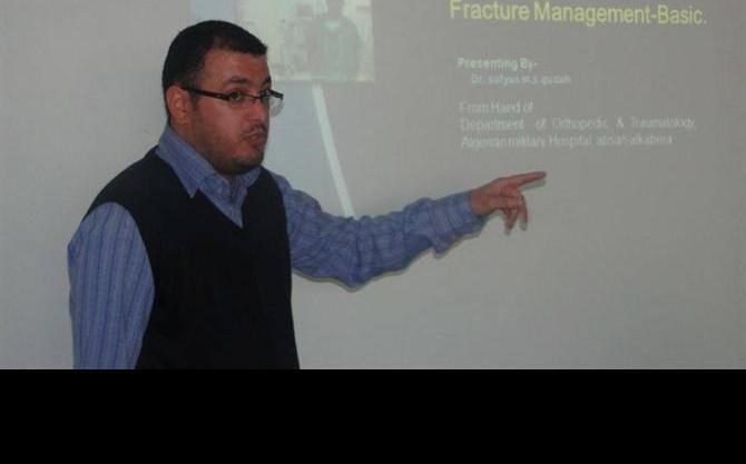 وقدَّم المحاضر د. سفيان قديح رئيس قسم العظام في المستشفى محاضرة عن أنواع كسور العظام وأسباب حدوثها وكيفية التعامل معها, منوهِّاً إلى أن أي تعامل غير طبي مع الكسر سيؤدي إلى مضاعفات في الكسر والطرف المصاب .