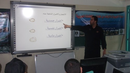 وحذر النجار الطلاب من الاقتراب من الاجسام المشبوهة والتي توجد بالقرب من أماكن القصف والابنية المهدمة والمواقع العسكرية وأنه يجب على الجميع عدم التعامل معها بتاتاً وما عليهم الا الاتصال على الشرطة الفلسطينية والتي بدورها تعمل على تفكيك هذه الاجسام والمواد المتفجرة .
