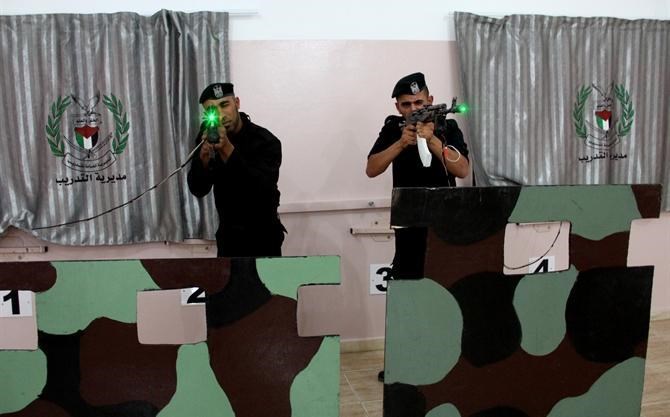 وفي مقدمة القاعة في الطابق الأرضي في مبنى التدريب وضع شاخصان خشبيان للتهديف، وفي الجهة المقابلة أقيم حاجزان وضعت عليهما بندقيتان من طراز "كلاشنيكوف" بعد إجراء تعديلات عليهما لإطلاق أعيرة ليزر تعمل بالتيار الكهربائي.