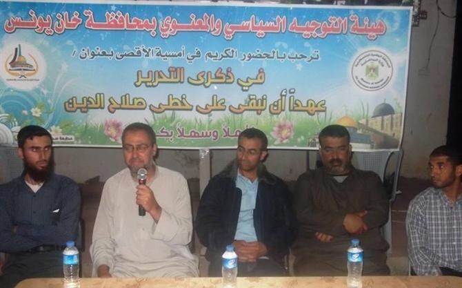 نظمت هيئة التوجيه السياسي والمعنوي بمحافظة خانيونس أمسية ثقافية تضامنًا مع المسجد الأقصى المبارك بعنوان "في ذكرى التحرير عهدًا أن نبقى على خطى صلاح الدين" وذلك في ساحة مكتب الهيئة بالمحافظة.