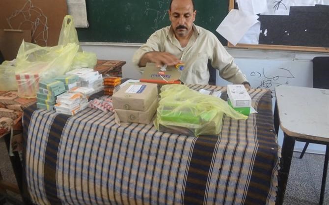 وتوزع أطقم الخدمات العلاج الطبي للمصابين والجرحى والمرضى من النازحين في مراكز الإيواء على مدار 24 ساعة.