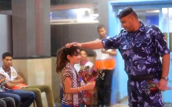 نظر رجل الشرطة للطفلة التي ترتدي على كتفيها الكوفية الفلسطينية والابتسامة تُغطي وجهه.