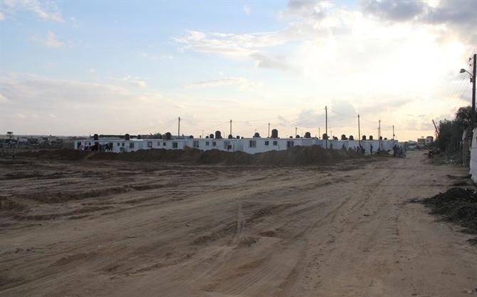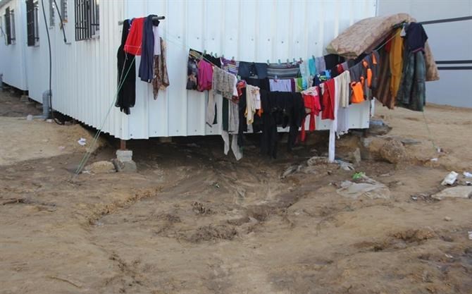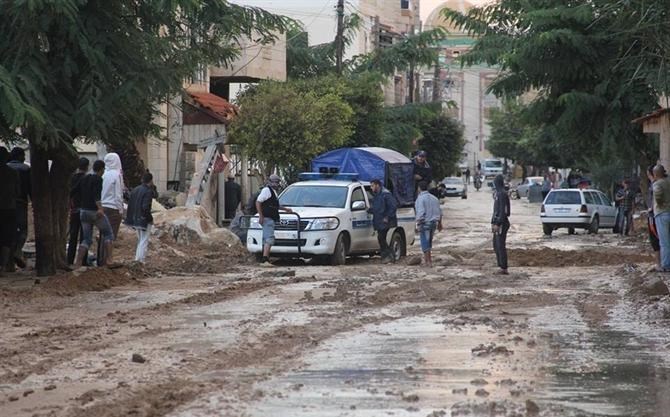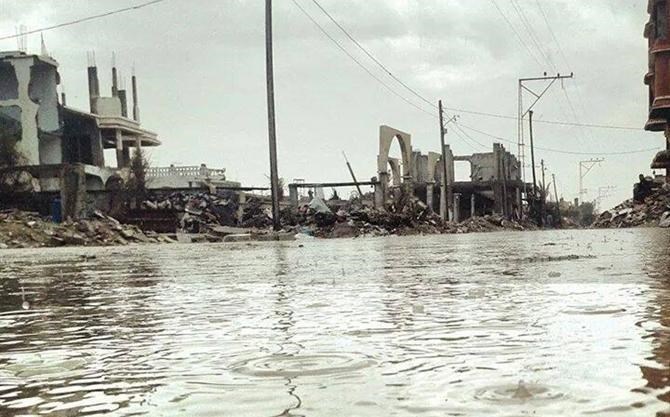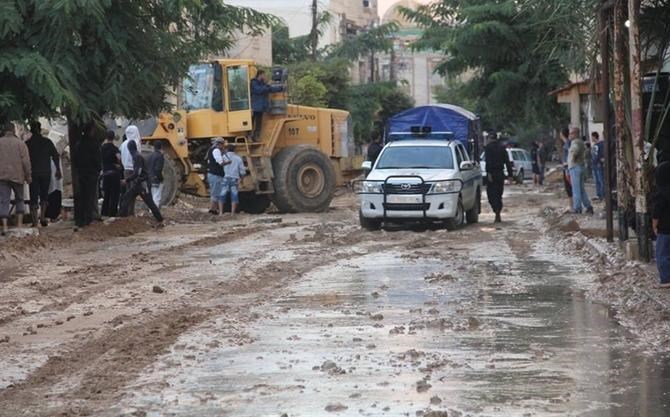 مياه الأمطار التي هطلت بغزارة أمس واليوم ، تدفقت بشكل سريع لمنطقة خزاعة المنكوبة أثناء الحرب الأخيرة التي وضعت بها الكرافانات للمواطنين على مقربة من مدخل البلدة.